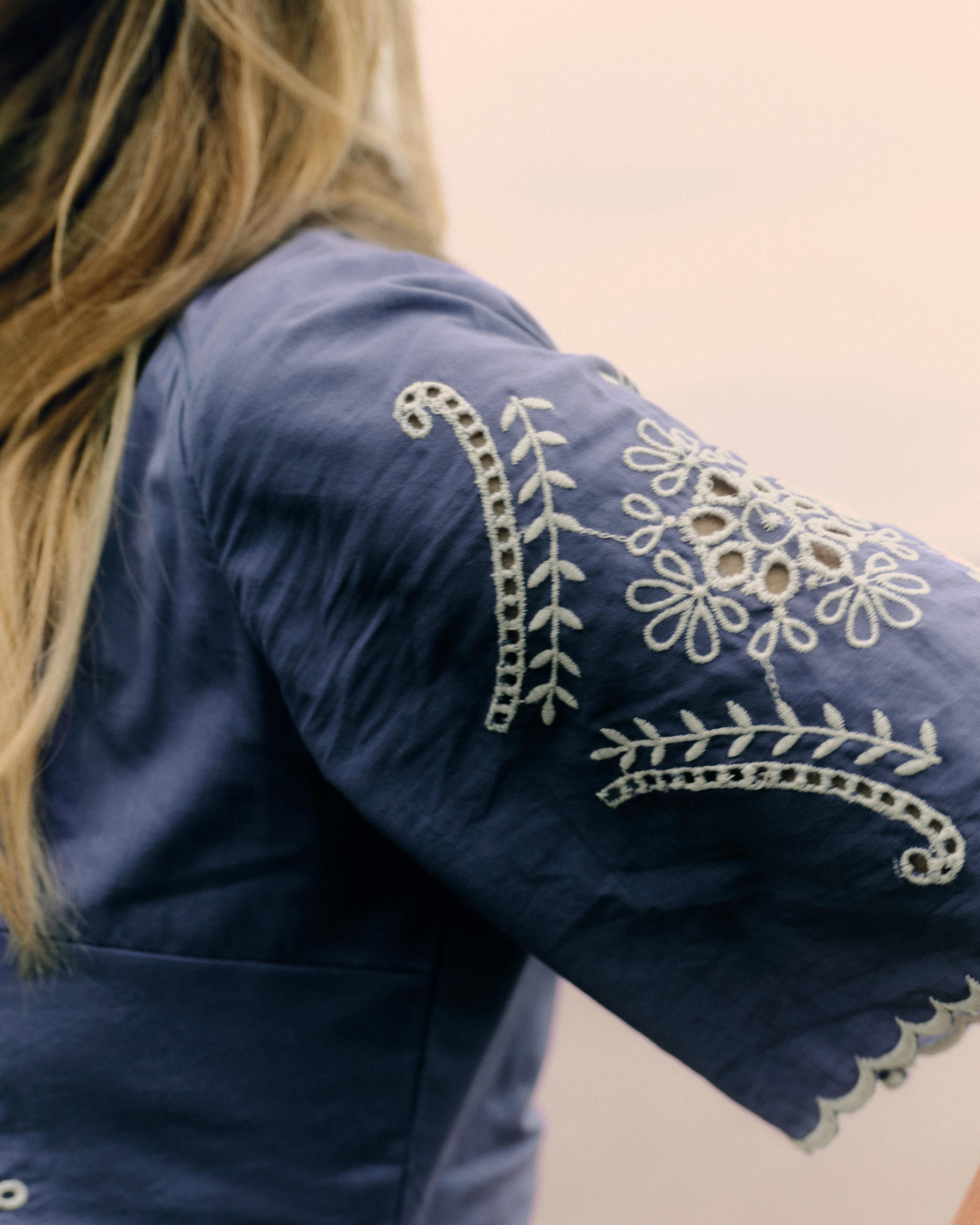 • Decorated with intricate eyelet embroidery and contrast stitching across the bodice and sleeves