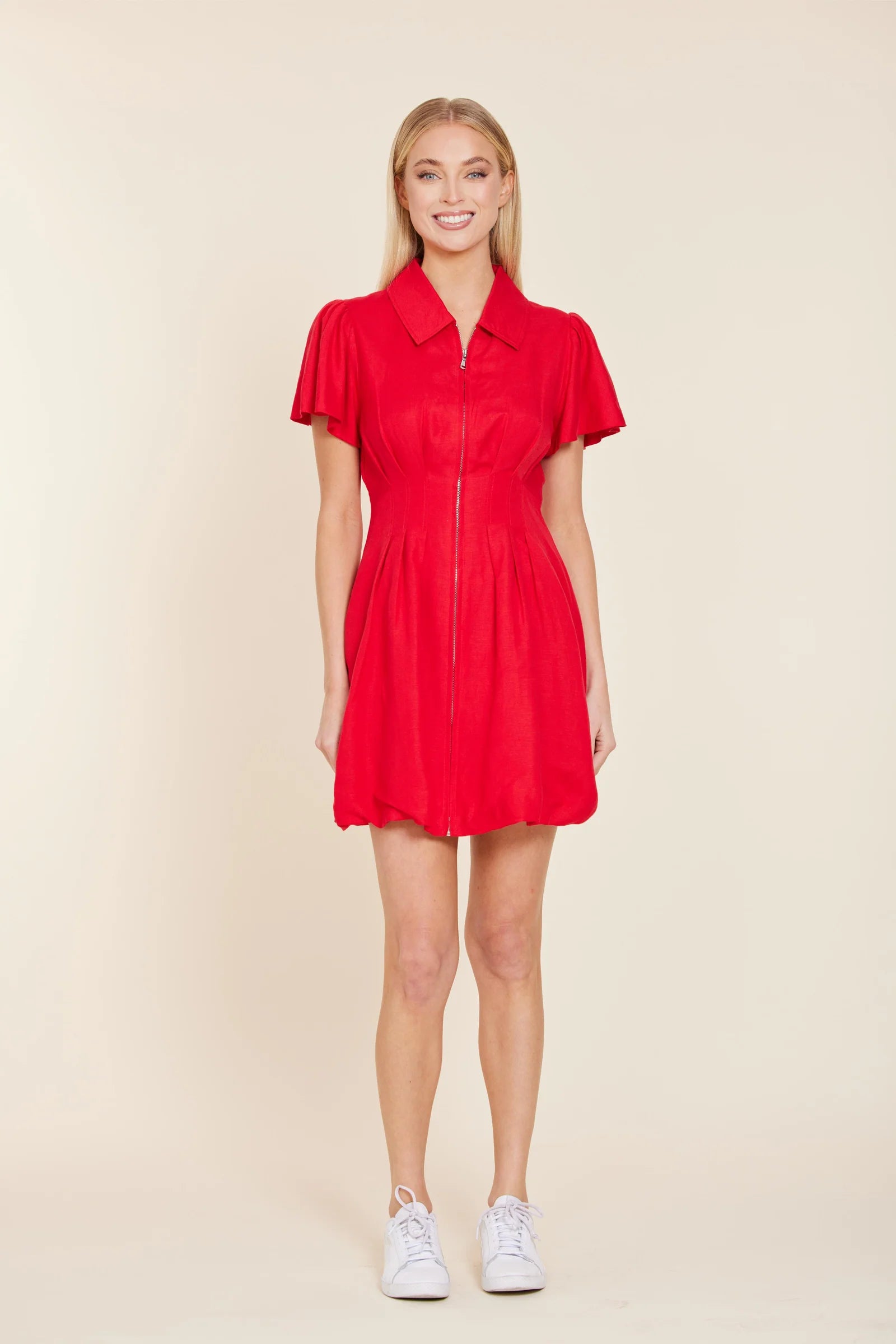 Bold, refined, and unapologetically feminine. This linen bubble dress features a tailored collared neckline, soft flutter sleeves, and a sleek front zipper for a modern, sculpted silhouette. Crafted from smooth, lightweight linen, it delivers statement-making style with warm-weather comfort—perfect for spring and summer occasions. The vibrant hues make it an elevated choice for Valentine’s Day outfits, Summer date nights, and special events, while the structured design ensures a timeless, luxury finish.