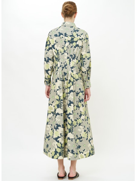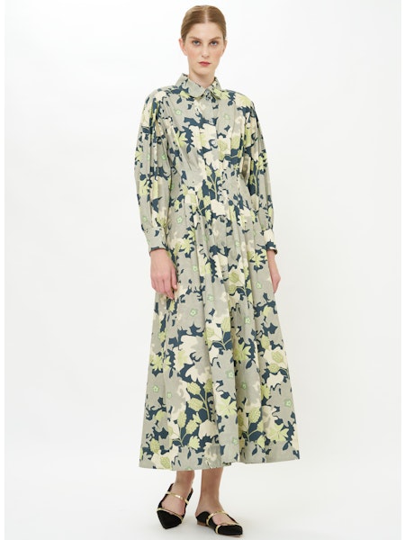 - Maxi a-line shirt dress silhouette with corset pleating throughout bodice and waist