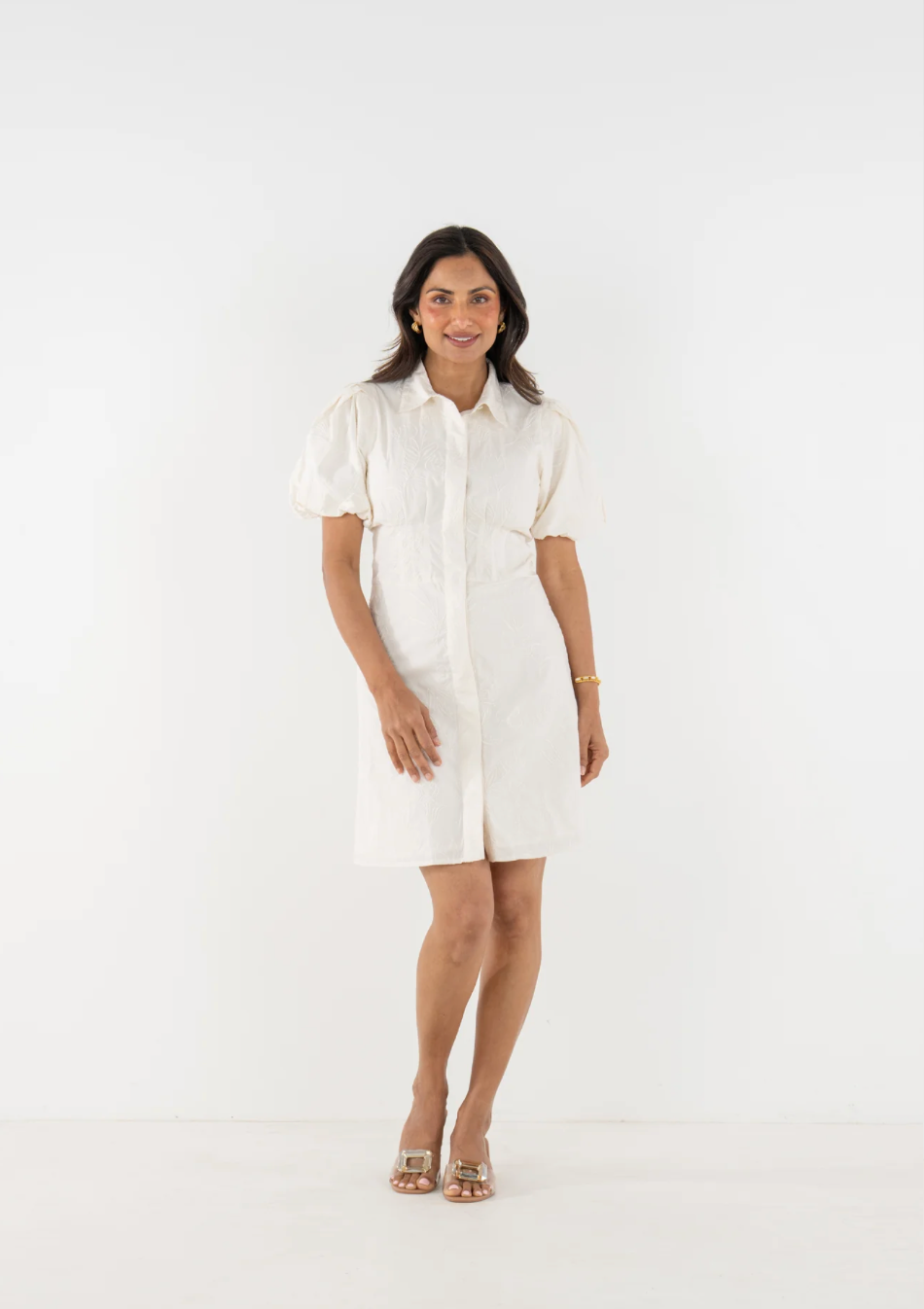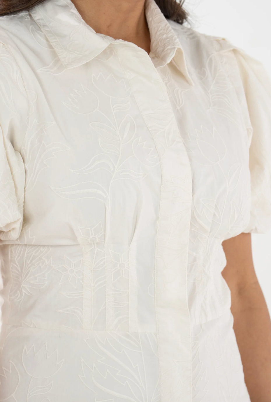 The Britt Dress in Gardenia is a classic staple designed for understated spring dressing. Featuring a classic fold collar, softly puffed sleeves, and a lightly boned bodice, it offers a beautifully structured yet feminine silhouette. Tonal floral embroidery adds subtle texture and interest throughout, while the front panel covered button closure lends a tasteful finish. A timeless addition to your spring capsule—made to be reached for again and again.
