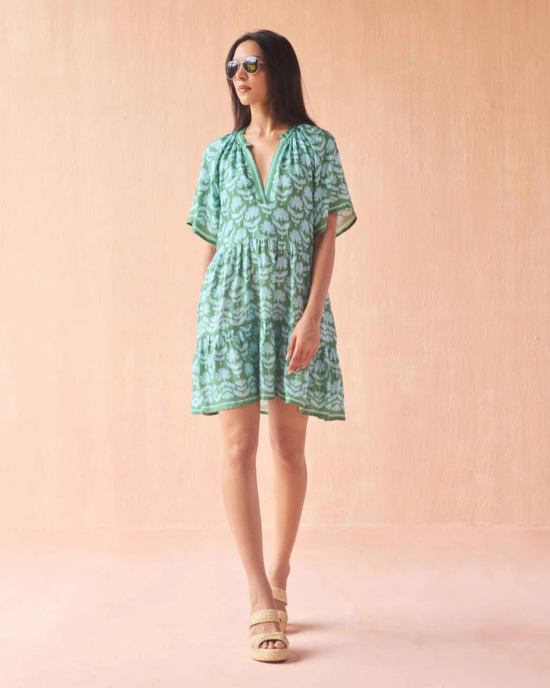 Vibrance and versatility unite in the Hadley Mini. She's ready for anywhere and anything—crafted with a flouncy tiered skirt, a relaxed fit and an adjustable neckline. Wear the tie open or closed, or use the hook and eye for additional coverage.