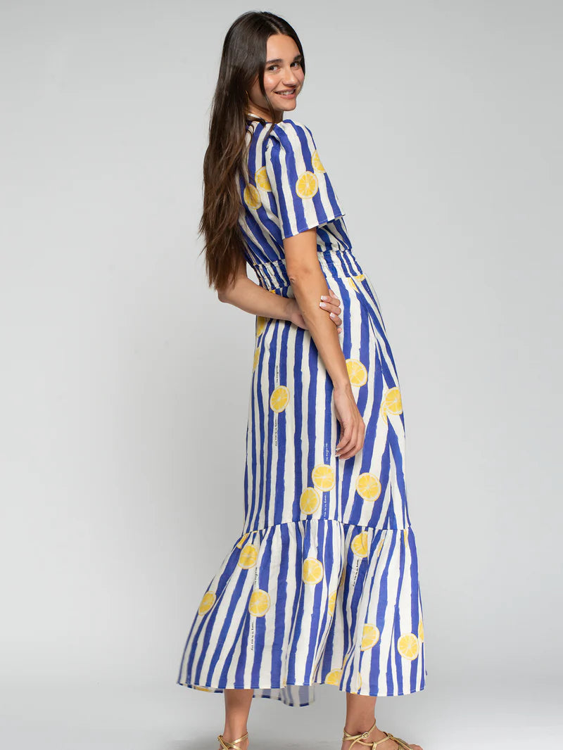 Long blue and white striped dress with a lemon print. V-neck, short sleeves, and a gathered waist. Ruffled hem.