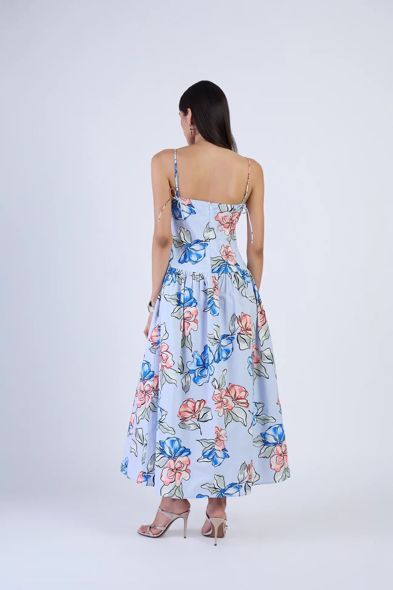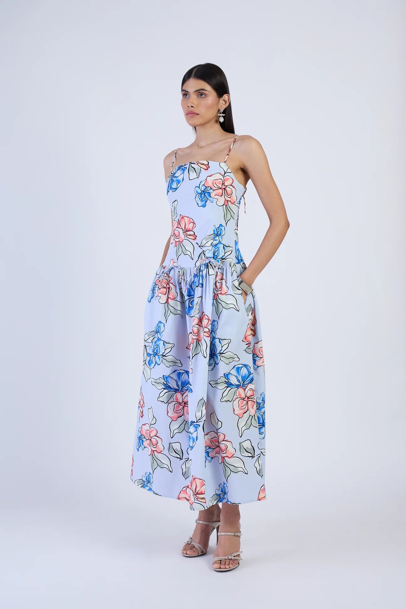 Be the best dressed guest in the head-turning Lucy dress. A flattering fitted bodice, drop waist, and adjustable straps meet charming bow details at the front and back. Finished with pockets and an elegant midi length. Lucy is made from breathable cotton twill, a softly structured fabric with a refined texture and elevated look. Modern yet soft, this pastel-toned print channels a sense of contemporary romance imagined for a ride through Rome in a vintage convertible. It captures the city’s timeless charm with a fresh, elegant feel.