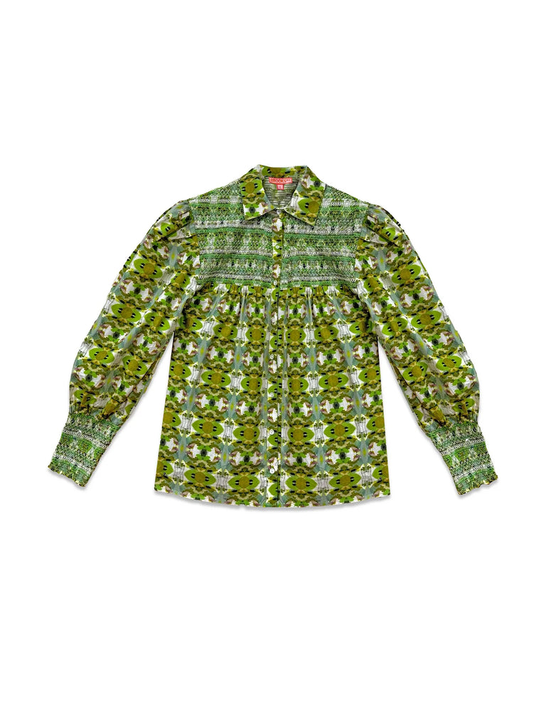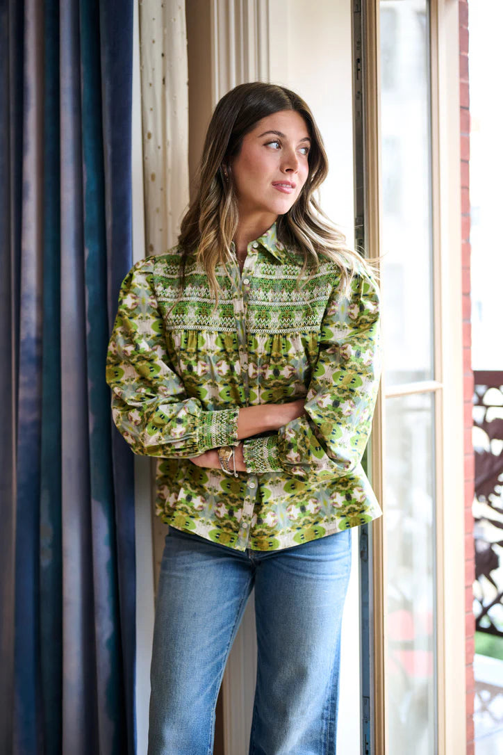 A fun twist on a Southern classic. The Penelope Smocked Blouse nods to traditional smocking with embroidered detailing across the chest, back, and cuffs, bringing artisanal charm to a modern silhouette. Crafted from soft cotton and digitally printed in an original Camo print, its rich palette of greens makes it a natural pairing with denim, earthy browns, soft blues, and everything in between. Feminine yet unfussy, it’s a standout for fall and beyond.
