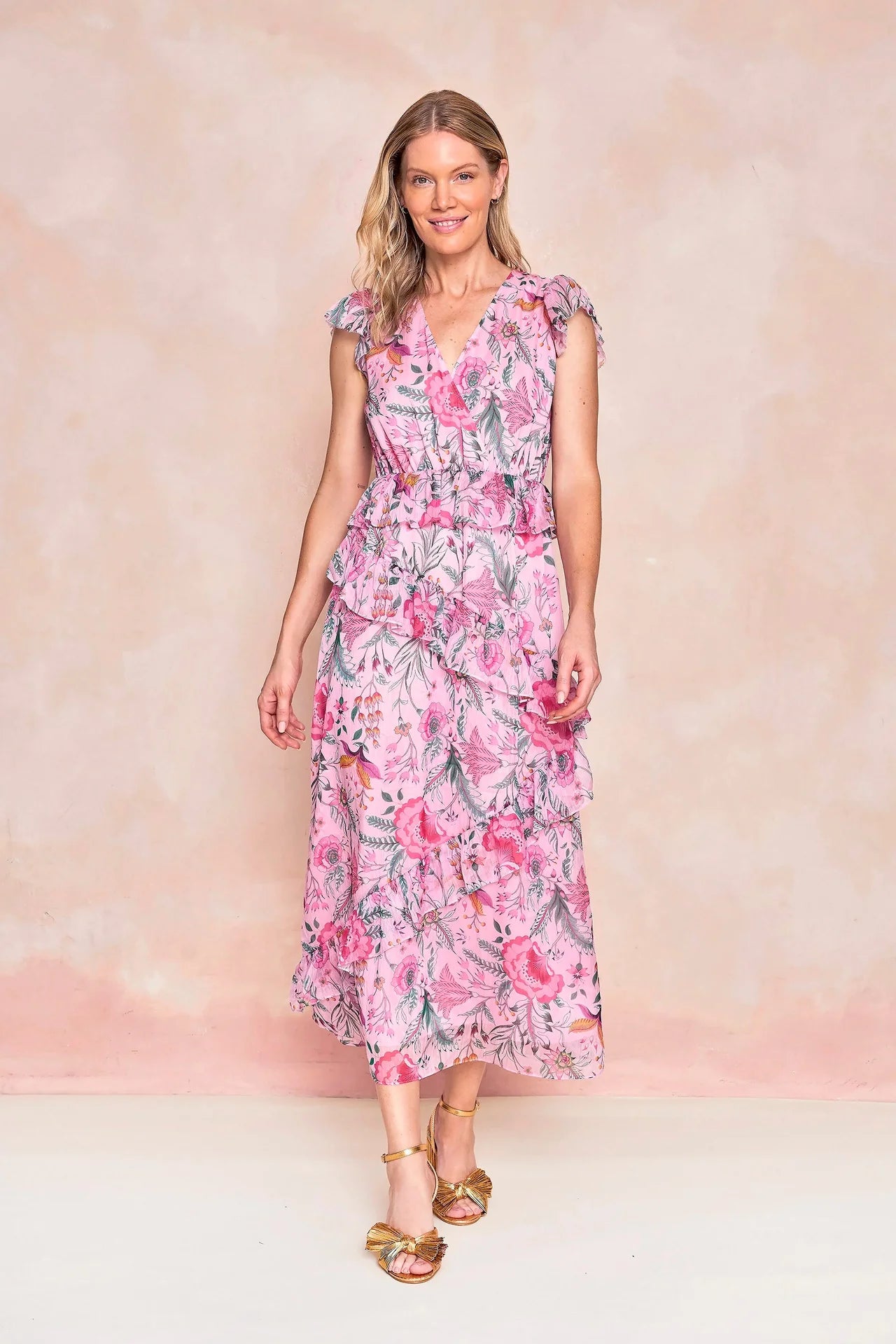A brand-new silhouette, the Petra is the most romantic spring dress yet. Crafted in ethereal chiffon with cascading ruffles down the skirt, she moves effortlessly with you. Finished in a feminine pink floral, she’s as beautiful as she feels.