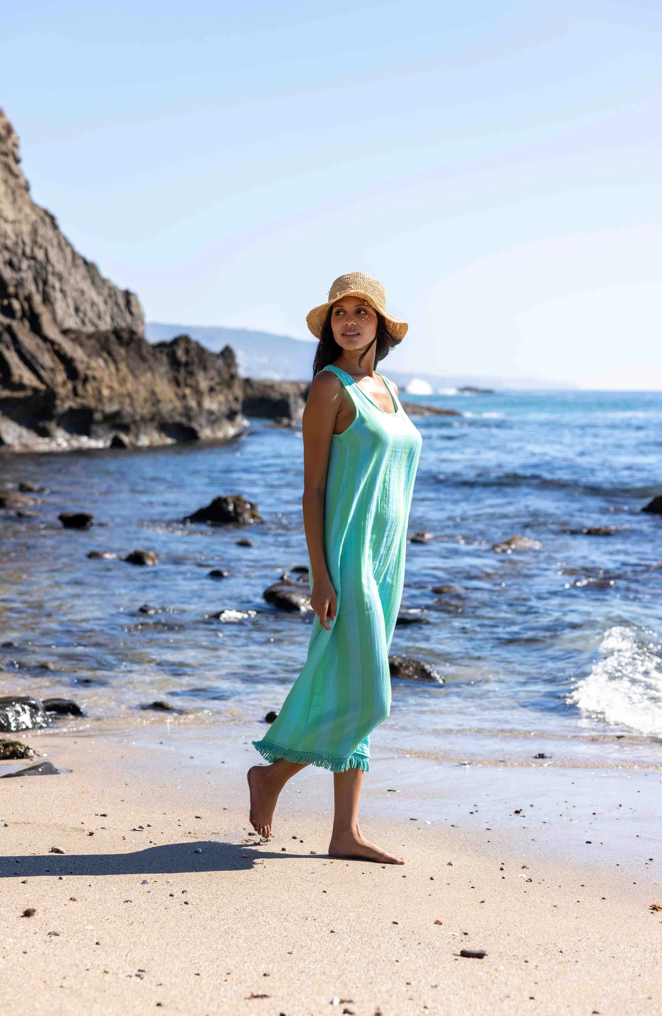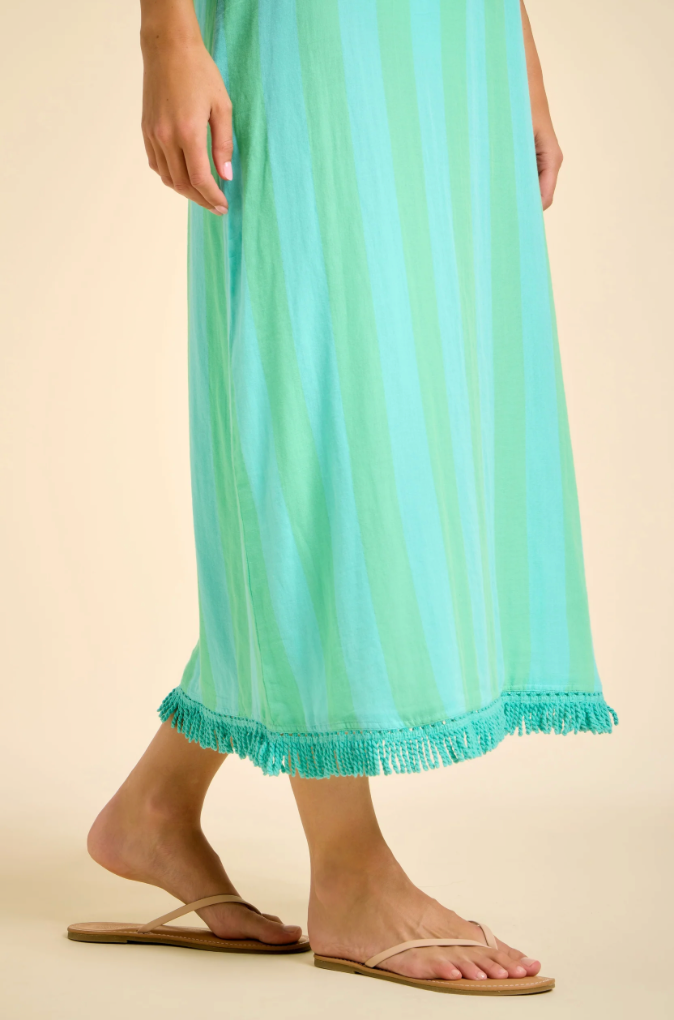 Easy, breezy, and endlessly wearable, the Positano Tank Dress is your go-to for sunny spring and summer days. Made from buttery soft cotton, it features bold blue and green cabana stripes and a playful fringe trim that adds just the right amount of flair. Whether you're heading to brunch, the beach, or anywhere in between, this feel-good favorite brings effortless charm to every warm-weather outing.