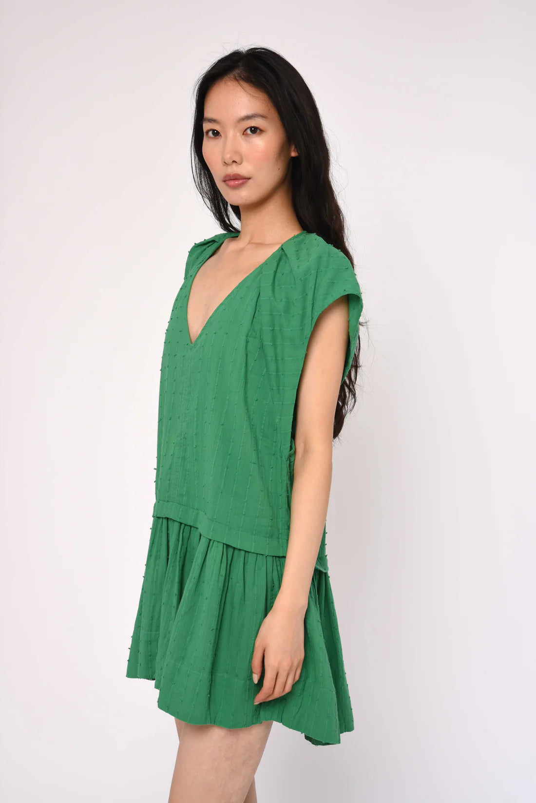• The Rae Mini Dress in Cotton Dobby fabric in bold Clover Green is your throw on dress for the season. It features a deep V neckline and a drop waist silhouette.