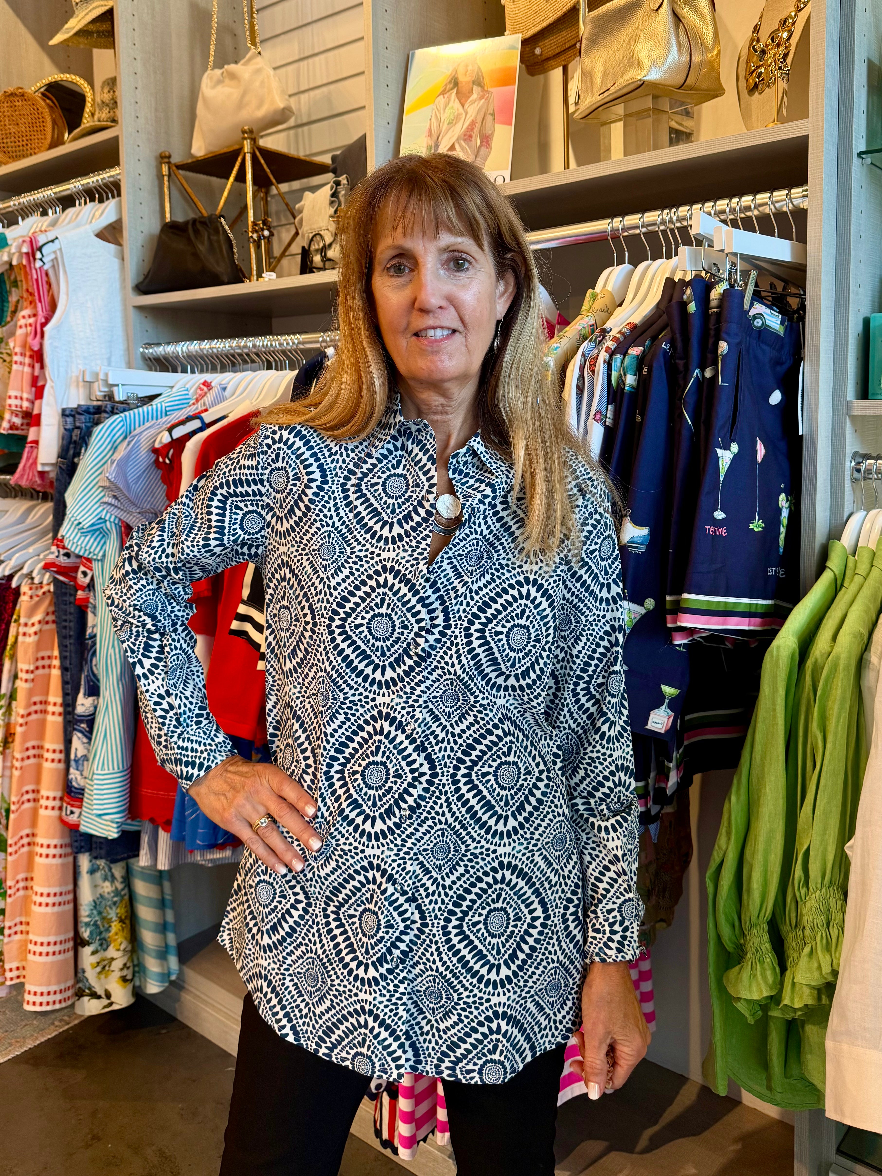 The Russell Top is a versatile button-up shirt designed in a flattering tunic length. Perfect for layering or wearing solo, this piece offers effortless style and comfort for any occasion. The classic button-front closure allows for easy adjustments, while the extended length provides coverage and a polished silhouette. Ideal for creating multiple looks throughout your wardrobe.