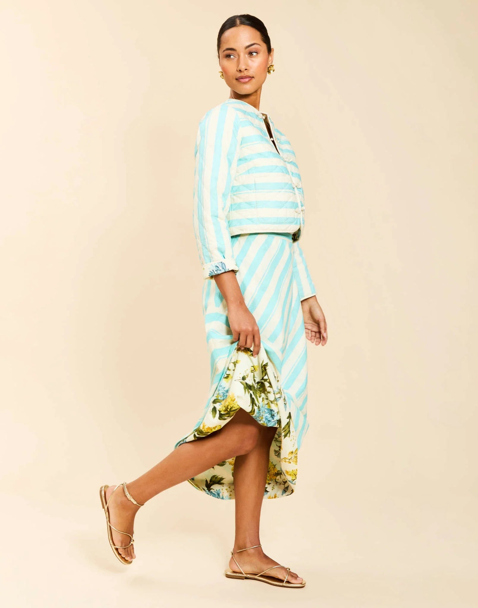 - A reversible design that transforms from stripe to floral in one effortless flip