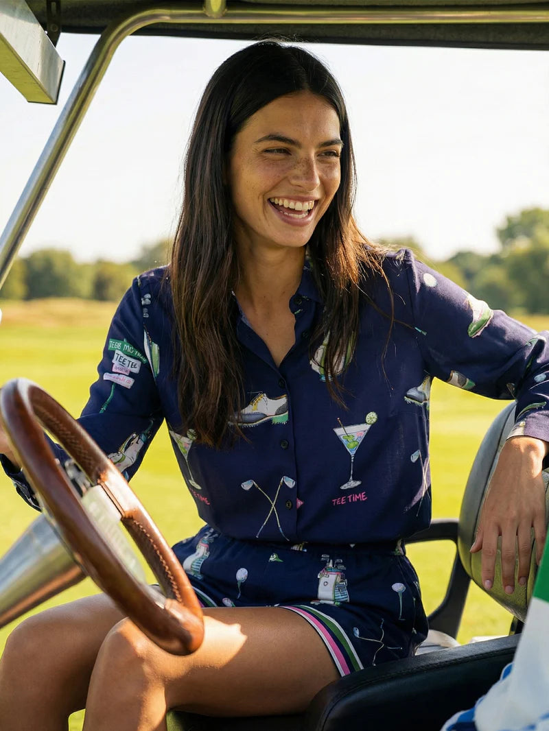 Navy blue shirt with an illustrated print of golf-related motifs: clubs, balls, bags, and shoes, accompanied by the text "tee time." Features a classic shirt collar, button-front closure, and long sleeves. The hem includes a decorative stripe in shades of pink, green, and white. Straight hem.