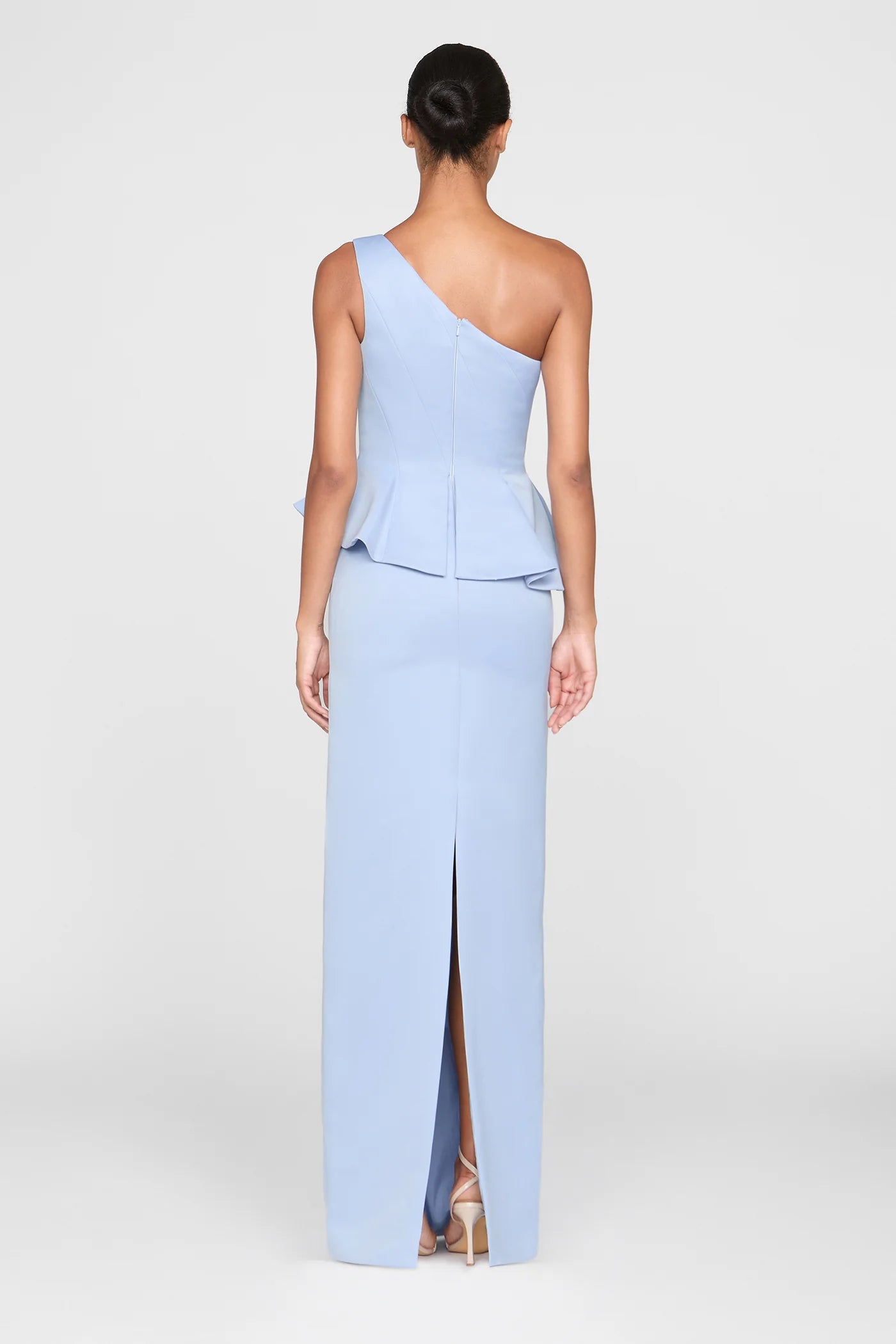 Duchess satin gown in a soft blue hue, defined by sculpted seam detailing and a refined peplum accent. Clean, modern, and quietly luxe. A polished choice for galas and formal evenings.