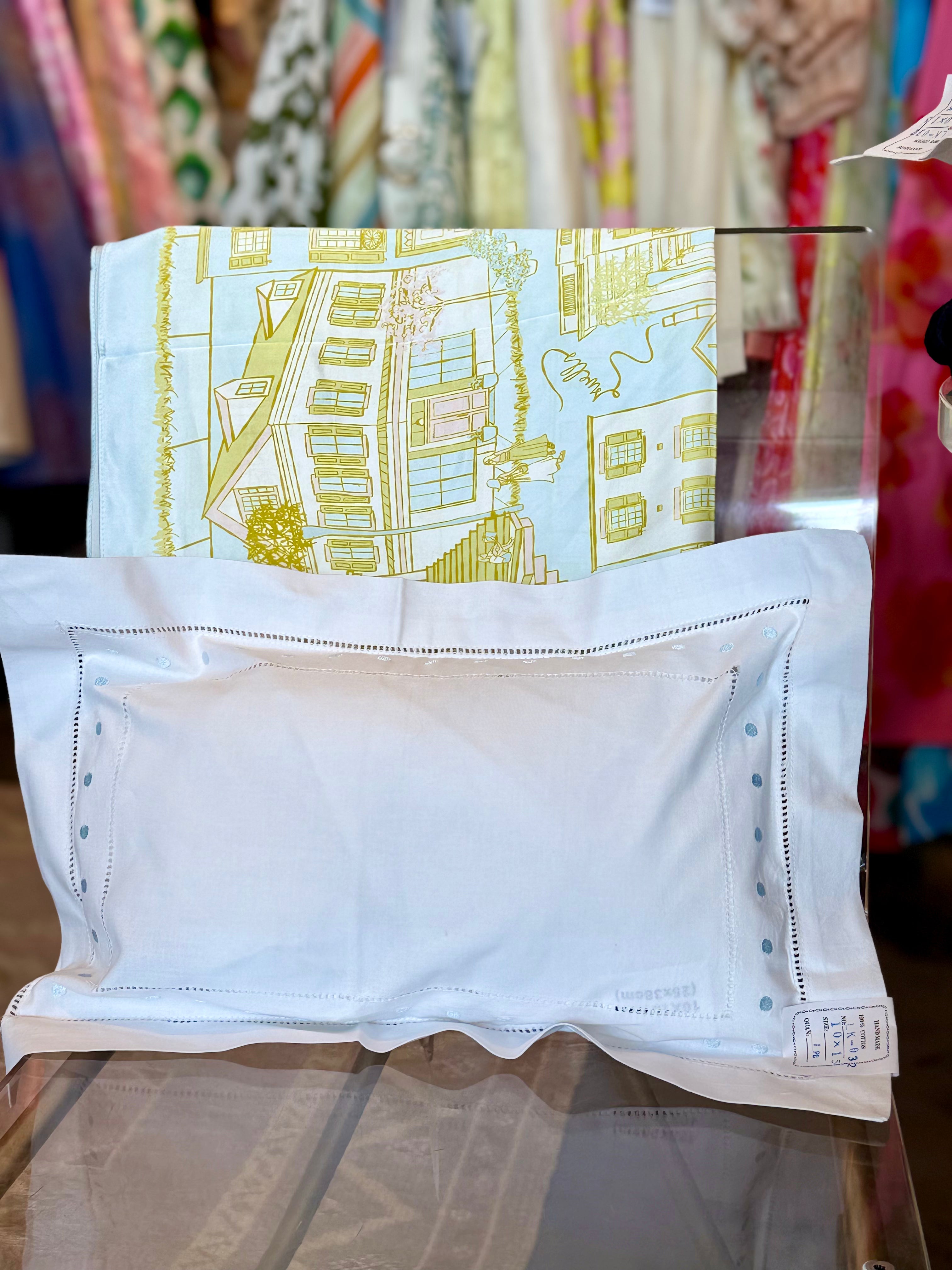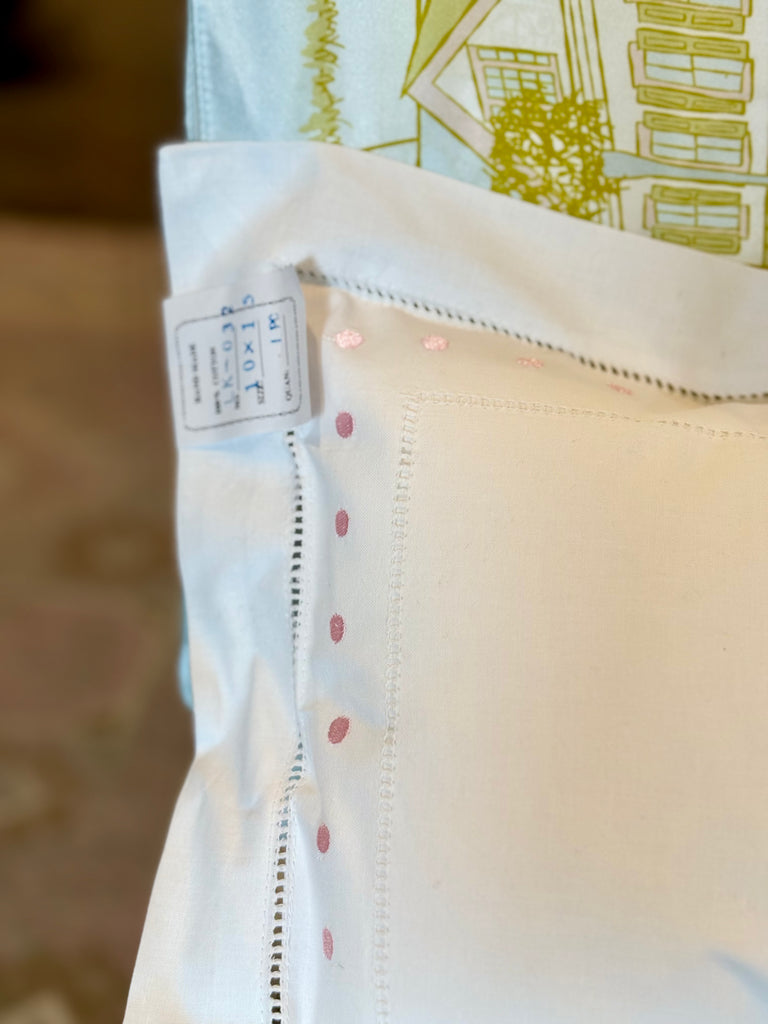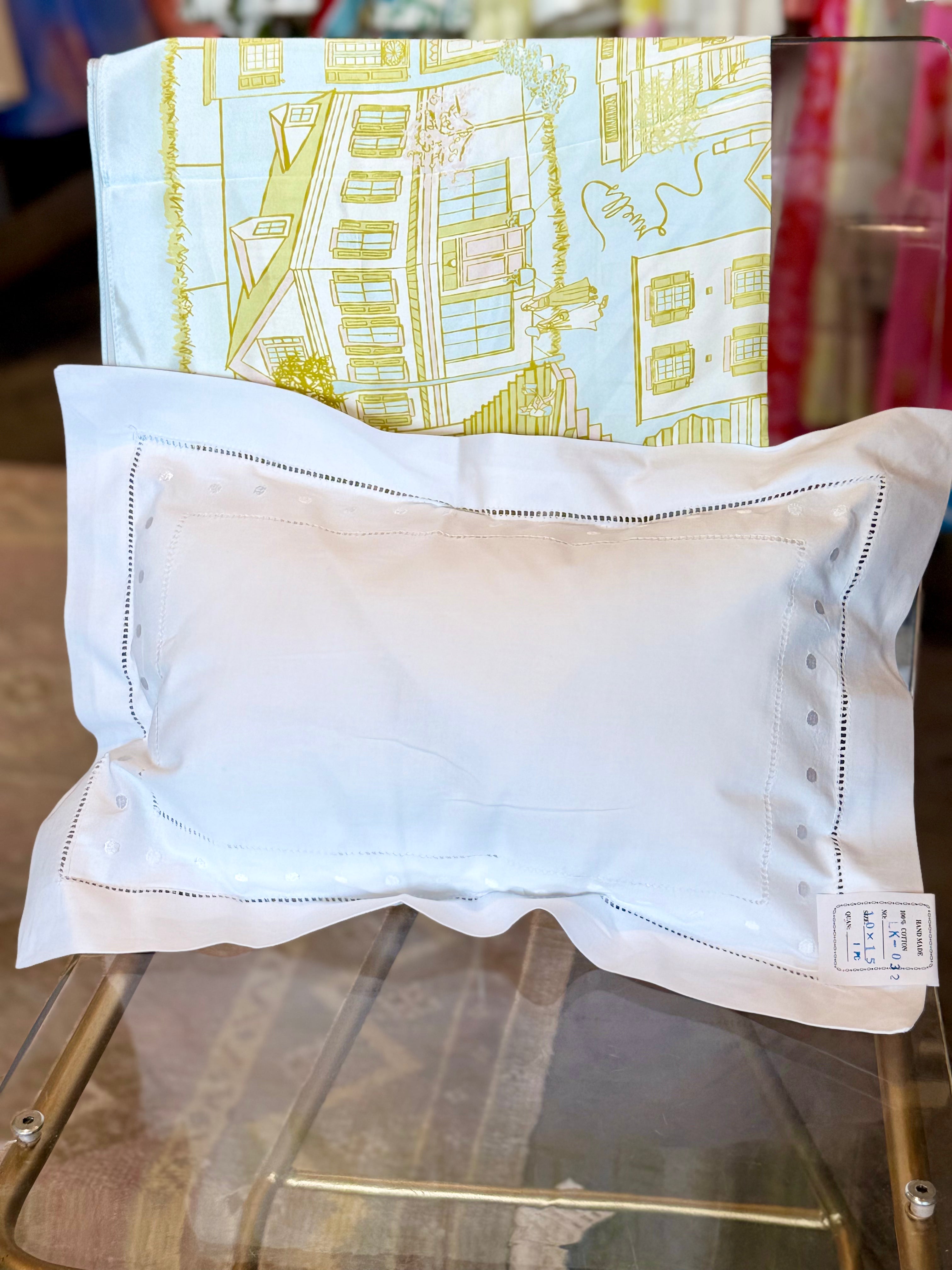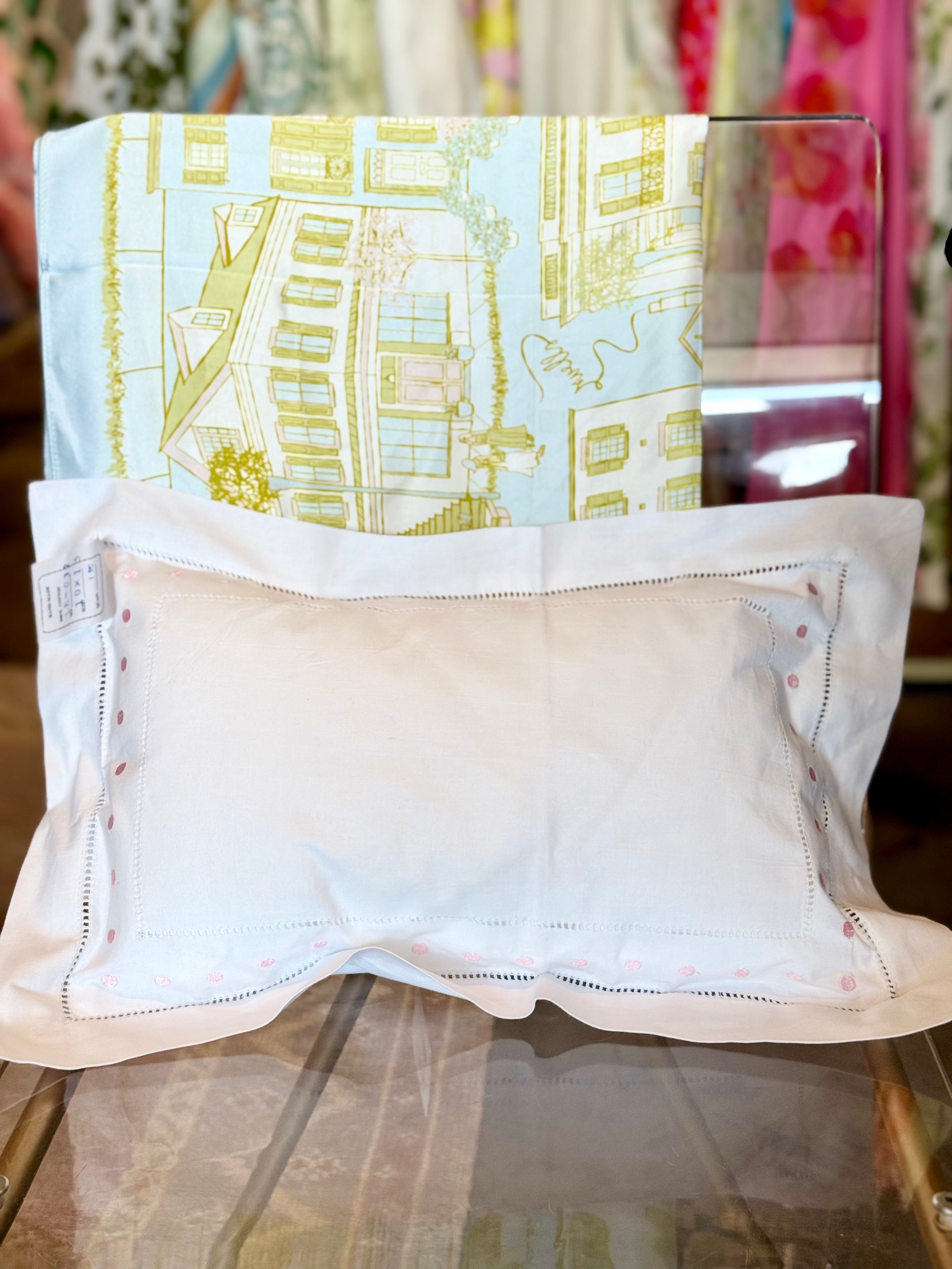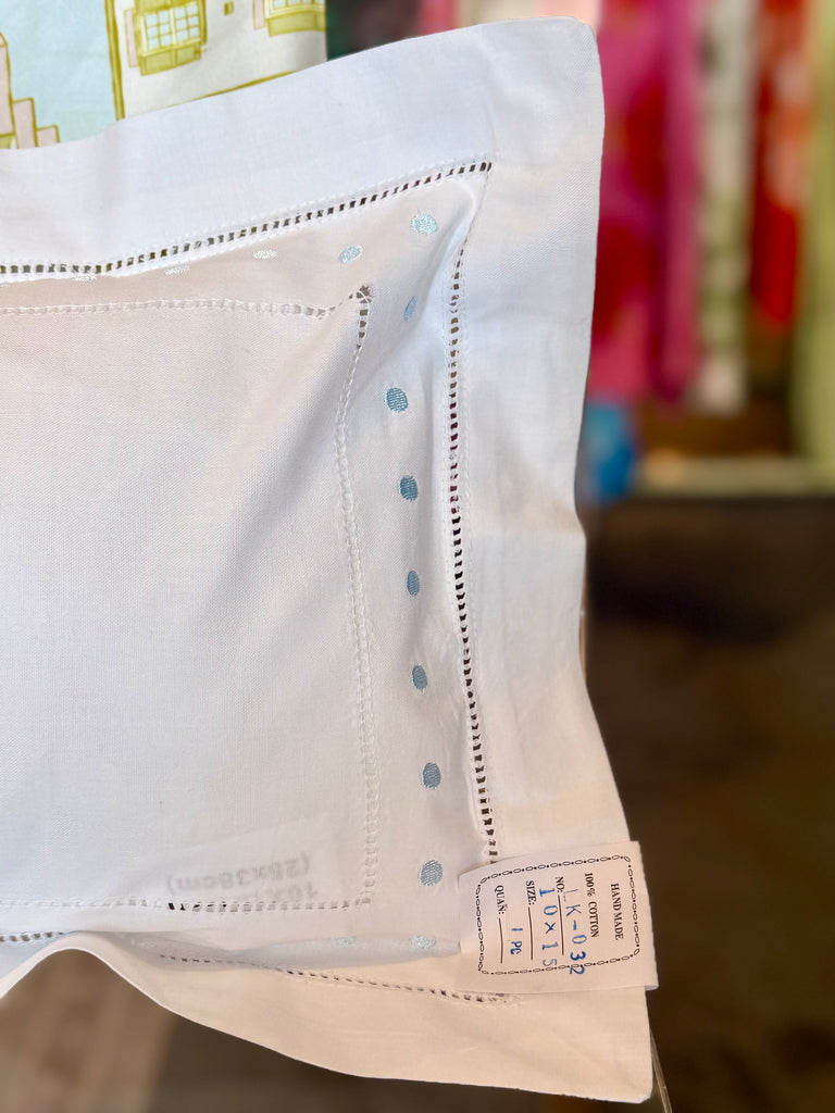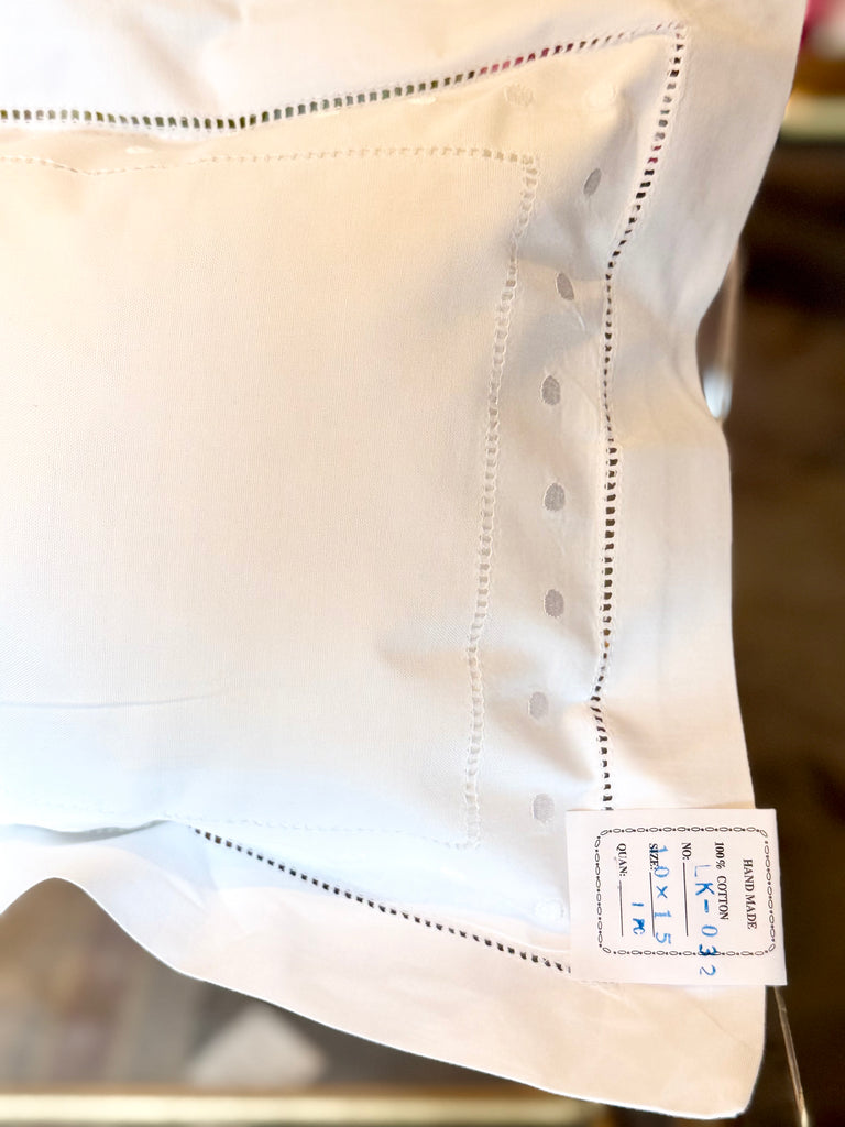 Expertly crafted 10"x15" baby pillow featuring elegant double hemstitch detailing and delicate Swiss dot pattern. The refined design provides a sophisticated touch to nursery decor while maintaining the gentle comfort essential for infants. Premium construction ensures durability through countless uses and washes.