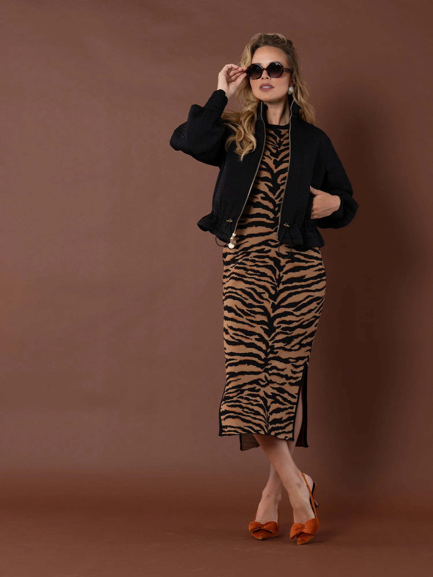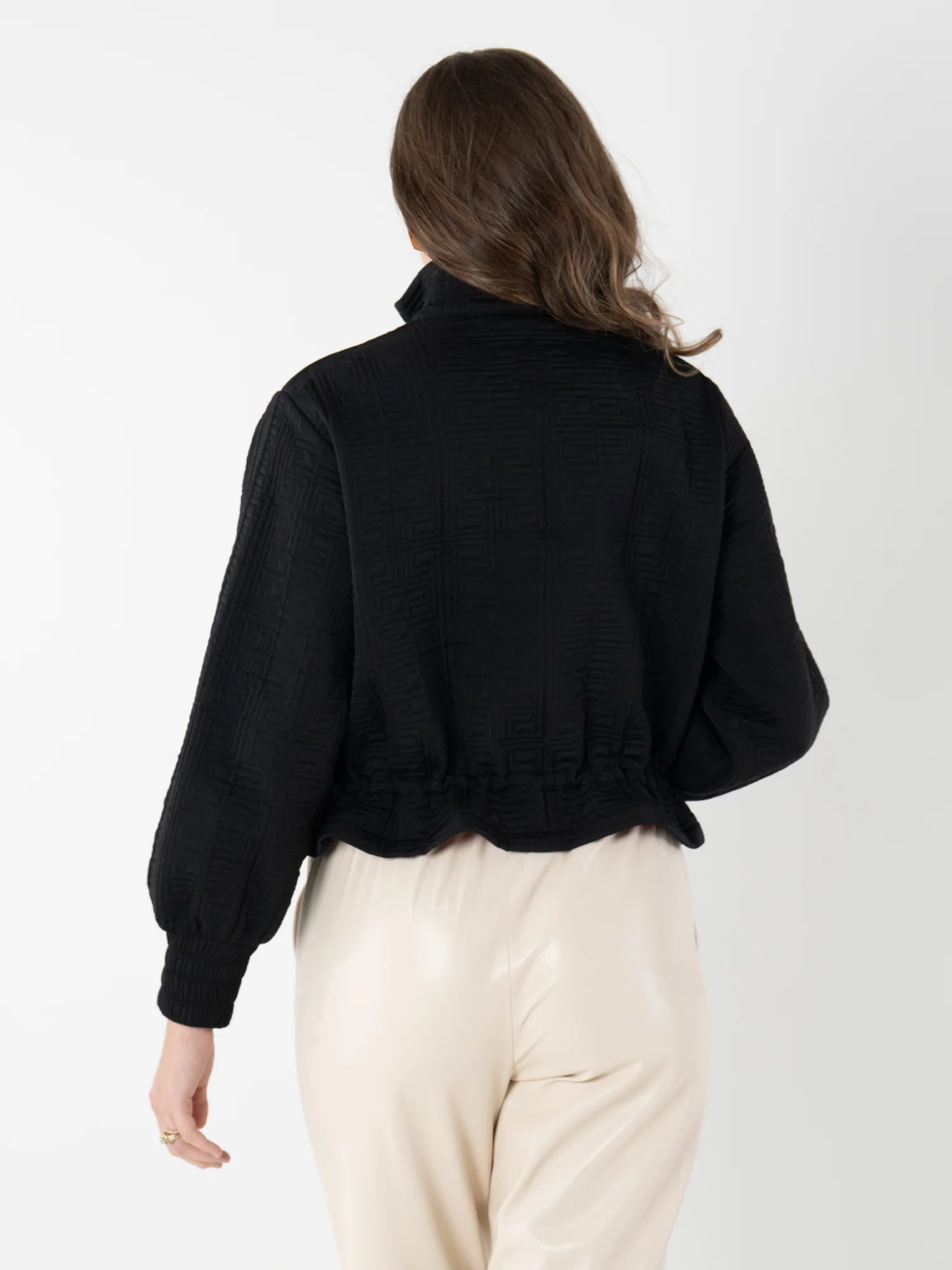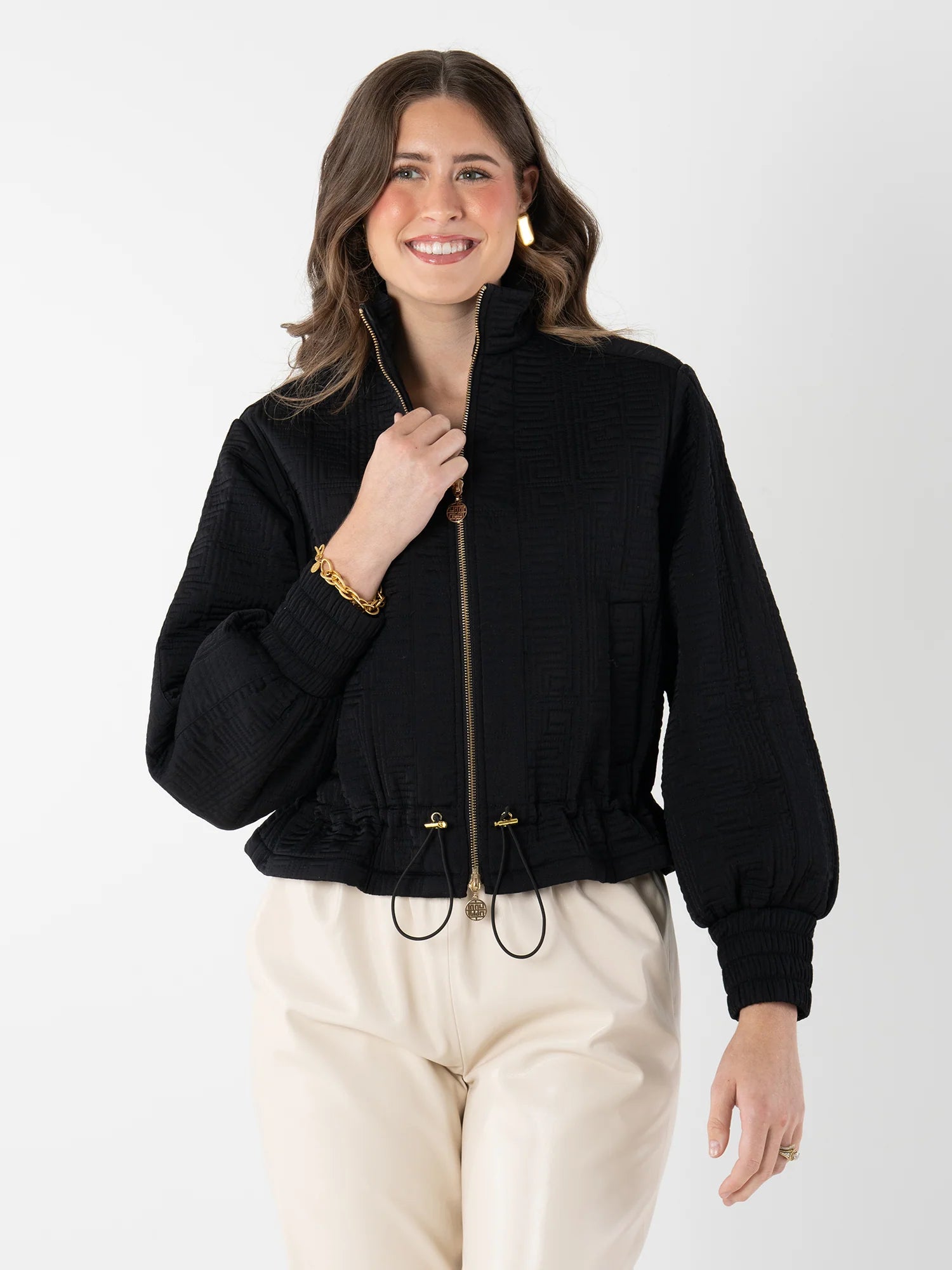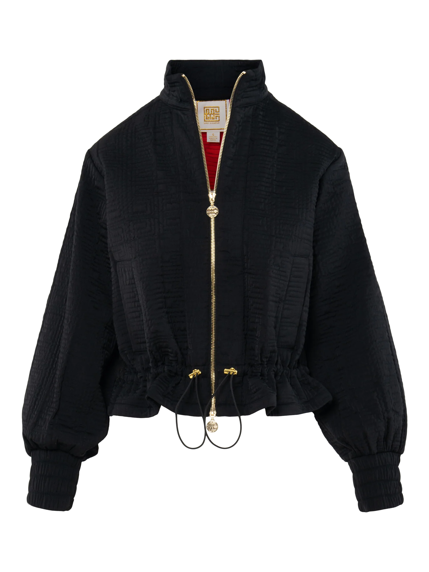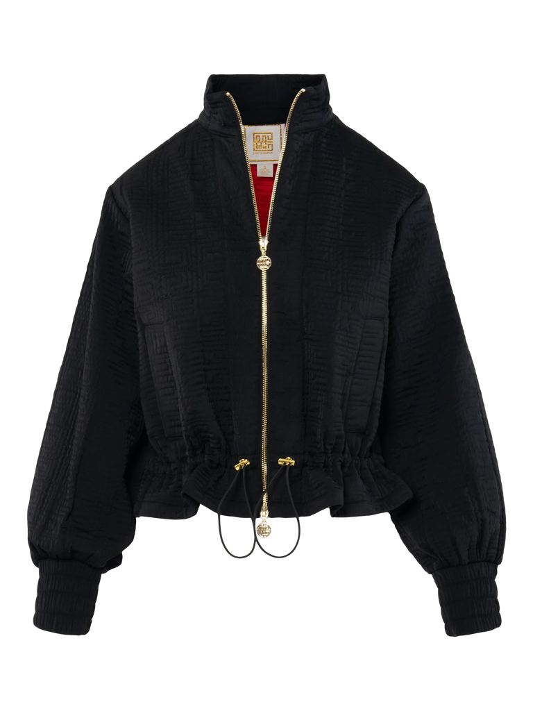 Elevate your outerwear game with the Bailey Bomber in Tap Shoe—a modern take on a timeless silhouette. This jacket features a classic stand collar and subtle blouson sleeves that add effortless volume and movement. The two-way front zipper is accented with a signature logo pull, offering both versatility and a bold design statement. An adjustable peplum hem with a sleek cord tie allows for a customizable fit, while the striking red lining adds a luxurious pop of color.