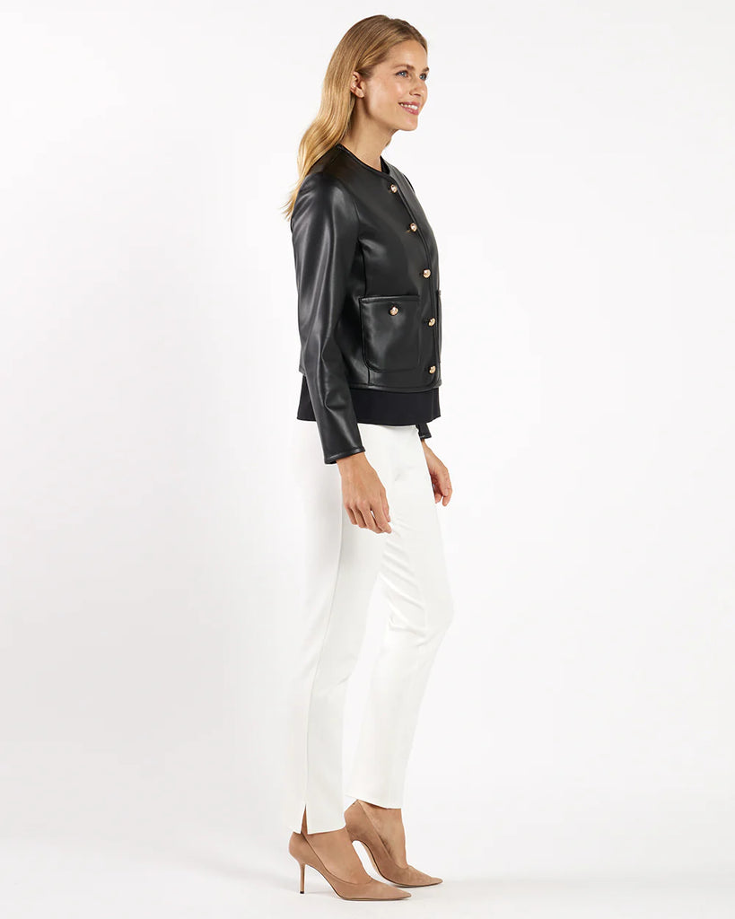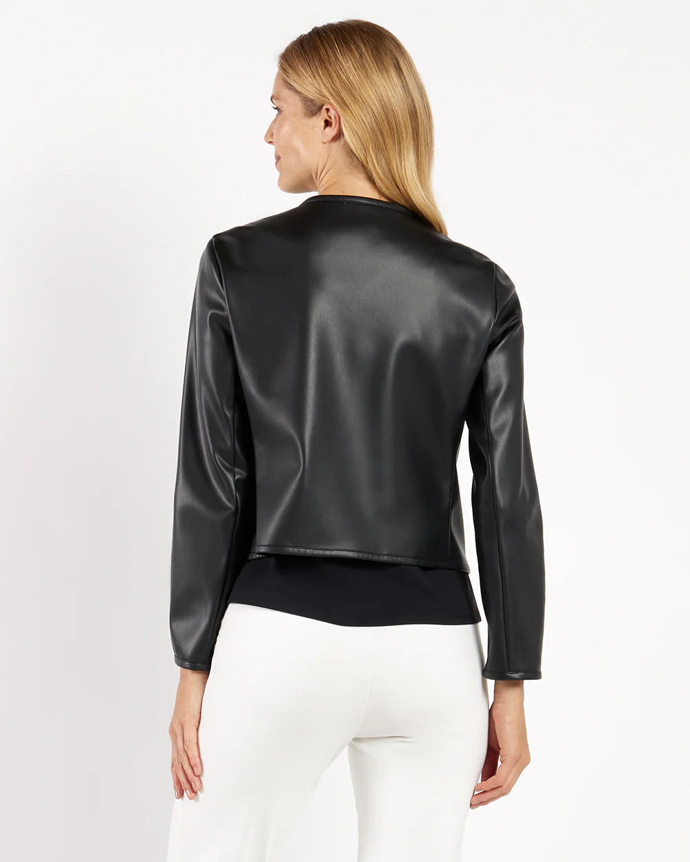 Meet your new fall favorite! The new faux leather jacket is designed to bring effortless edge and polish to your wardrobe. Featuring a classic crew neckline, long sleeves, and gold button details, this style is effortlessly timeless and chic. We recommend sizing up to layer over dresses or pair it with your favorite pant for a look that can transition you seamlessly from day to night.