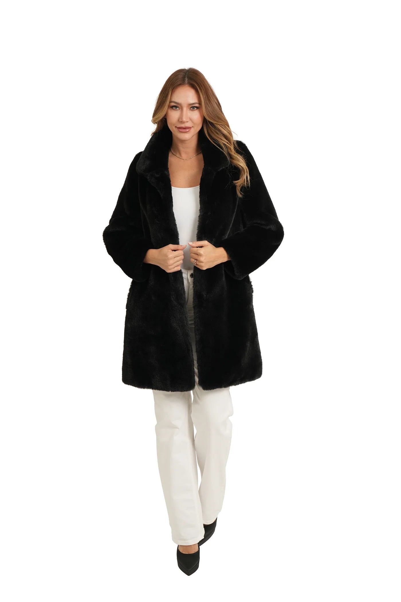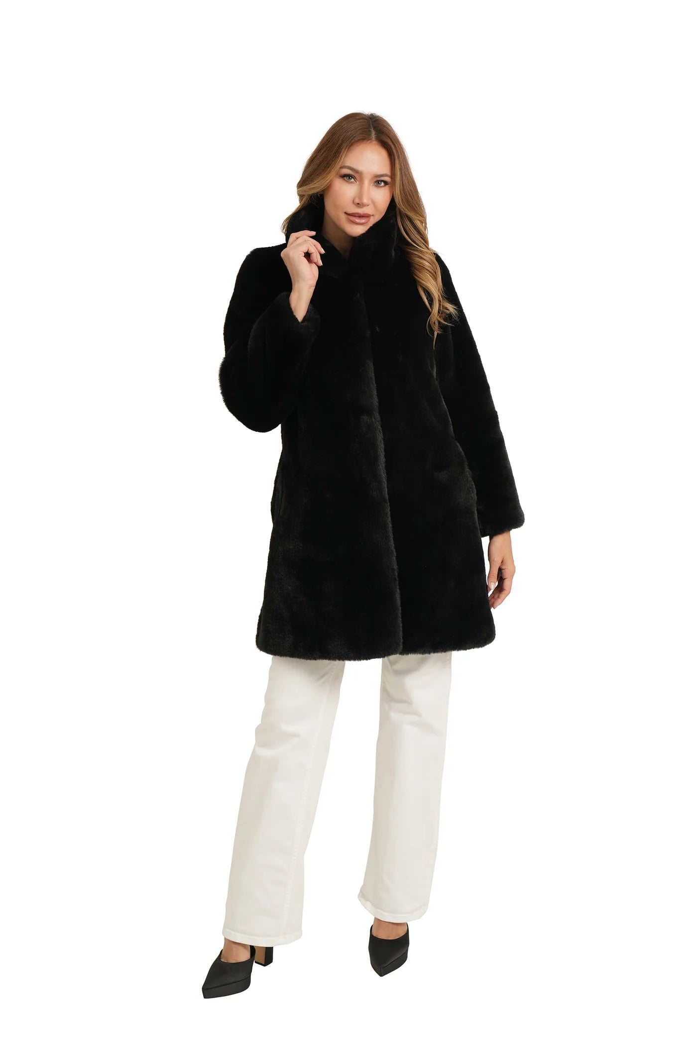 Turner faux fur coat, stand collar, hidden eye & hook closure, slit pockets on front body, hem lands on mid thigh, relaxed fit.