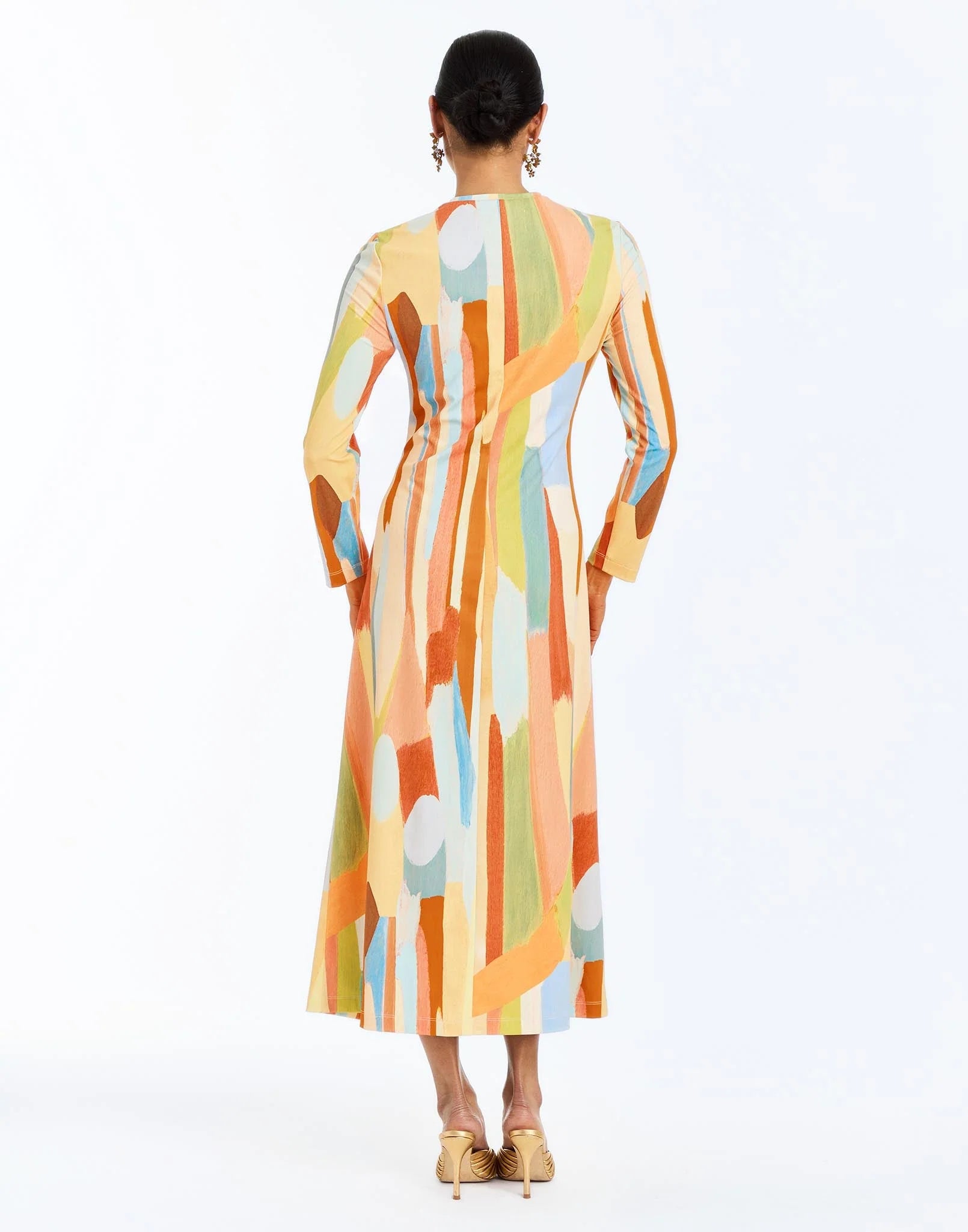 The Gabriella Midi Dress in Fresco Tides is an effortless daytime staple designed in soft, stretch jersey for a flattering fit. This new print brings life to a Mestiza favorite, featuring a body-skimming silhouette, elegant crew neckline, and a slimmed A-line skirt. Side-seam ruching adds subtle shaping, while full-length sleeves offer a polished finish perfect for everyday sophistication.