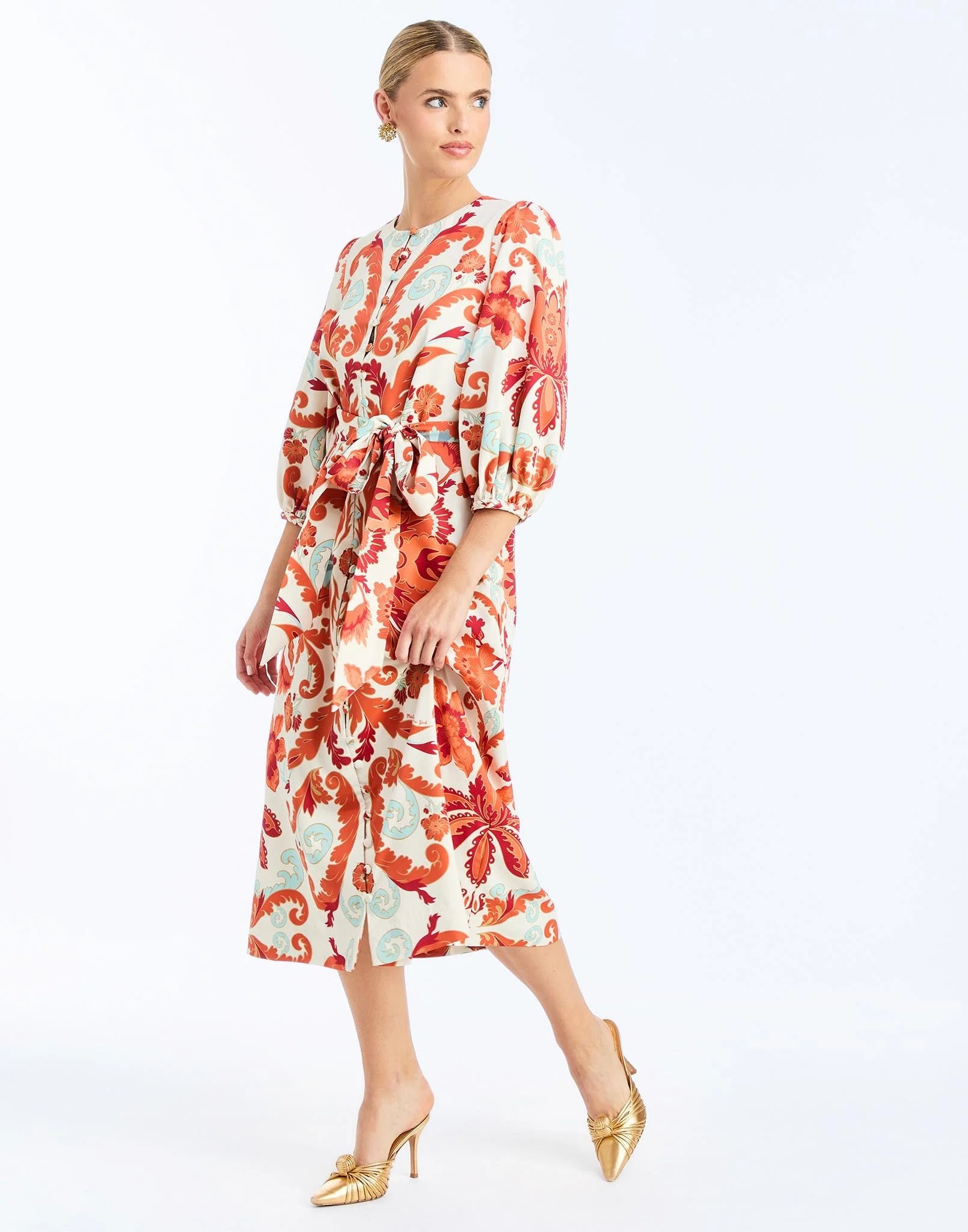 The Suzanna Midi Dress in Rossa Waltz brings effortless daytime elegance to every occasion. Designed in a new Mestiza print, this A-line midi features romantic three-quarter balloon sleeves, a flattering self-tie waist, and a beautifully draped skirt made for movement. Perfect for daytime events, luncheons, or polished weekends, it blends ease, femininity, and signature Mestiza charm.
