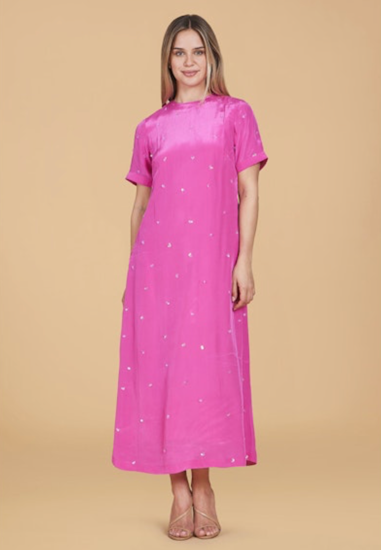 The Gwenyth Dress features a straight silhouette with a midi length and a discreet back slit, providing ease of movement and comfort. Its short sleeves and round neckline make it suitable for casual wear or elevated occasions like a date night.