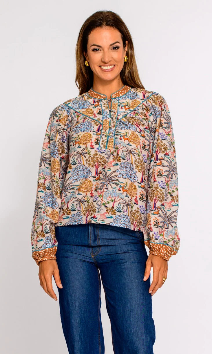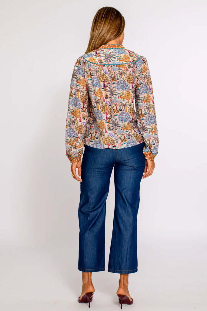 Hannah is a new long sleeve blouse silhouette, featuring a front & back yoke, balloon sleeves, and partial front kissing placket. Her light cotton silk fabric is perfect for easing into the cooler weather.