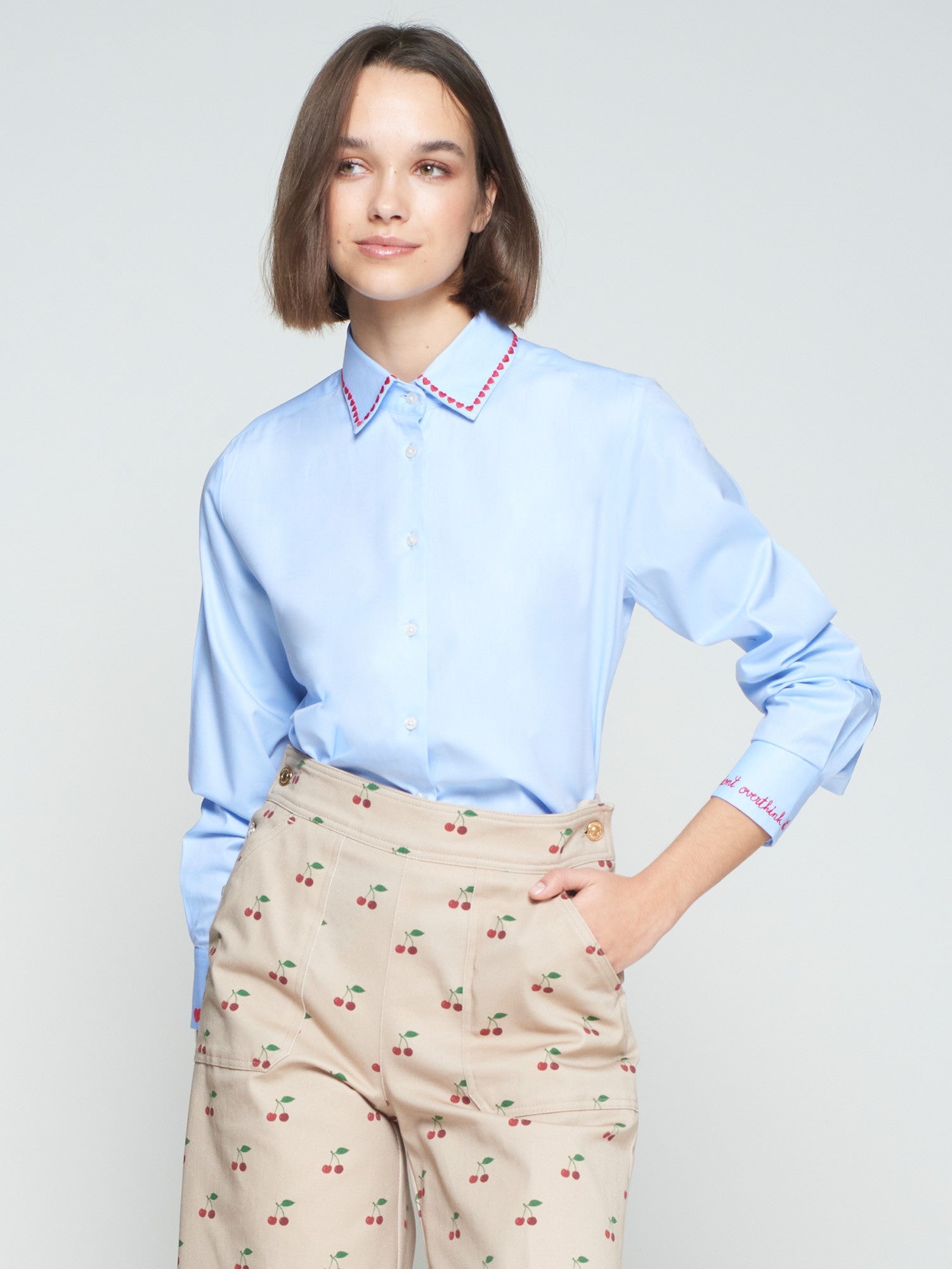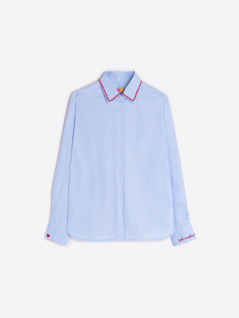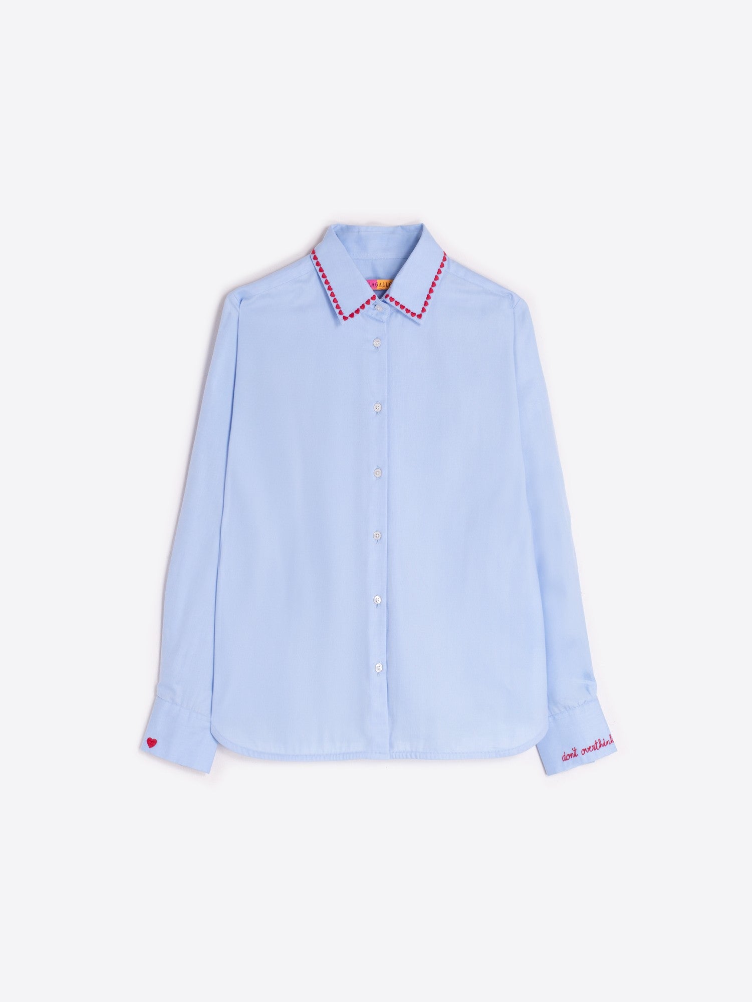 Classic-fit light blue shirt with a pointed collar embroidered with a line of red hearts. Red “Don’t overthink it” text embroidered on the cuff and a “Made with love” message on the back of the collar in black thread. Front closure with visible buttons. Curved hem. Structured yet light poplin fabric.
