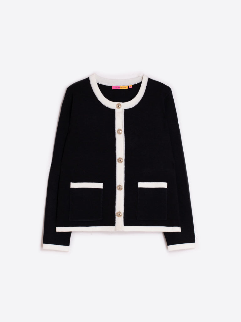 Black cardigan in a structured knit with round neckline and front closure featuring gold buttons. Contrasting ecru trims frame the neckline, placket, cuffs, hem, and pocket openings. Straight silhouette with a dense, elegant texture. Designed for transitional and autumn styling.