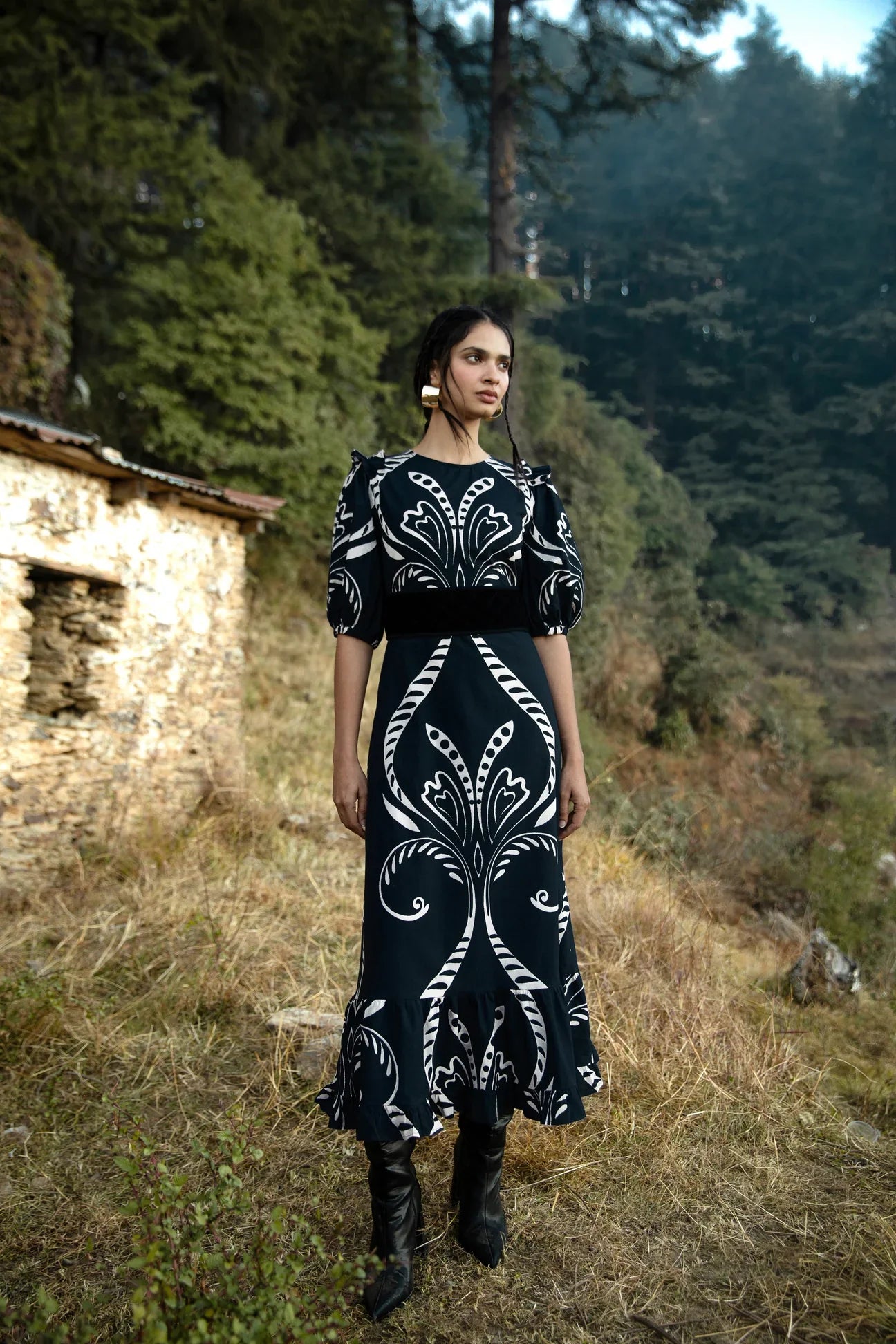 The Antonia is a wonderful choice for special occasions and everyday agendas alike. Cut with puffed sleeves, elastic cuffs and adorned with subtle frills, the Antonia falls to a slender A-line creating a flattering silhouette. Accentuate the waist with the featured belt. Antonia is crafted from crisp cotton poplin, breathable and soft against the skin. ‘Fountain’ is a print artwork that draws from the pure, revitalizing waters of a serene river, capturing that sense of renewal and tranquility.