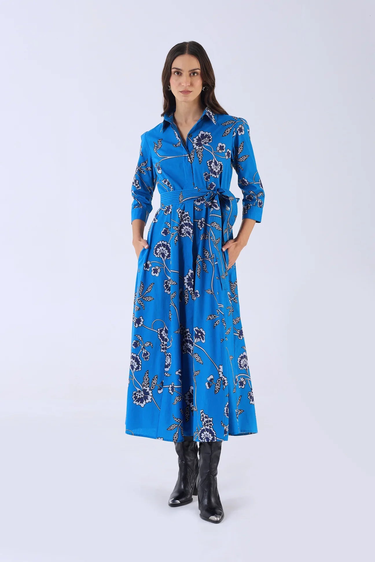 The popular Emily is a classic shirt dress with an elegant ease and flattering, effortless silhouette. The dress buttons down at the front and features 3/4 sleeves. Accentuate the waist with the featured belt. Emily is crafted from crisp cotton poplin, breathable and soft against the skin. The print evokes childhood days by the river, collecting wildflowers to press as keepsakes. The design recalls the memory of finding those blooms preserved in an old book.