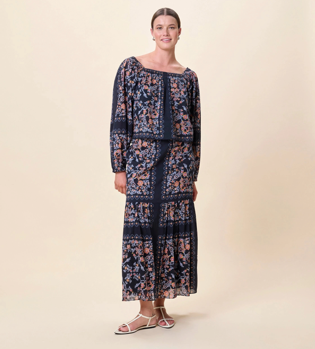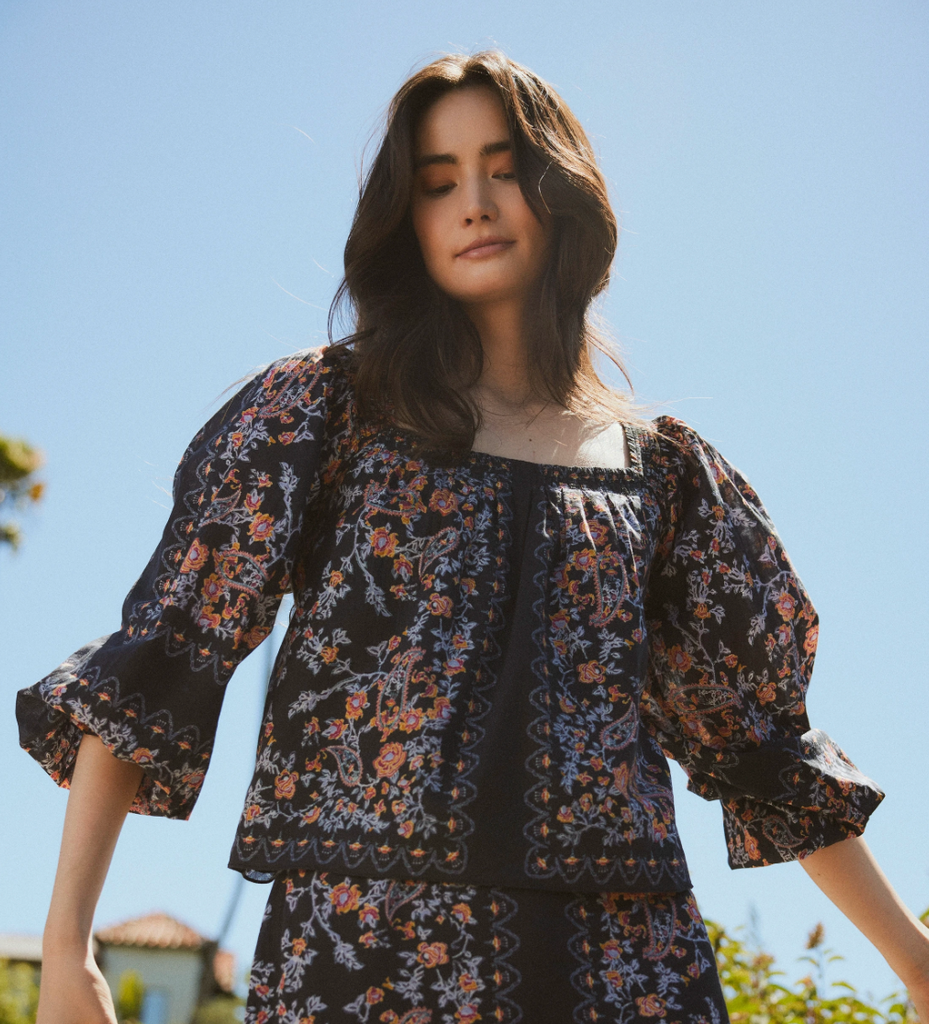 Ethically handmade in India from 100% GOTS-certified organic cotton, the Lucille Blouse is a romantic, off-the-shoulder top designed in our signature Dark La Ramos print. Featuring a relaxed silhouette with elasticized cuffs and neckline, and detailed floral placement throughout, it offers an effortless bohemian feel.