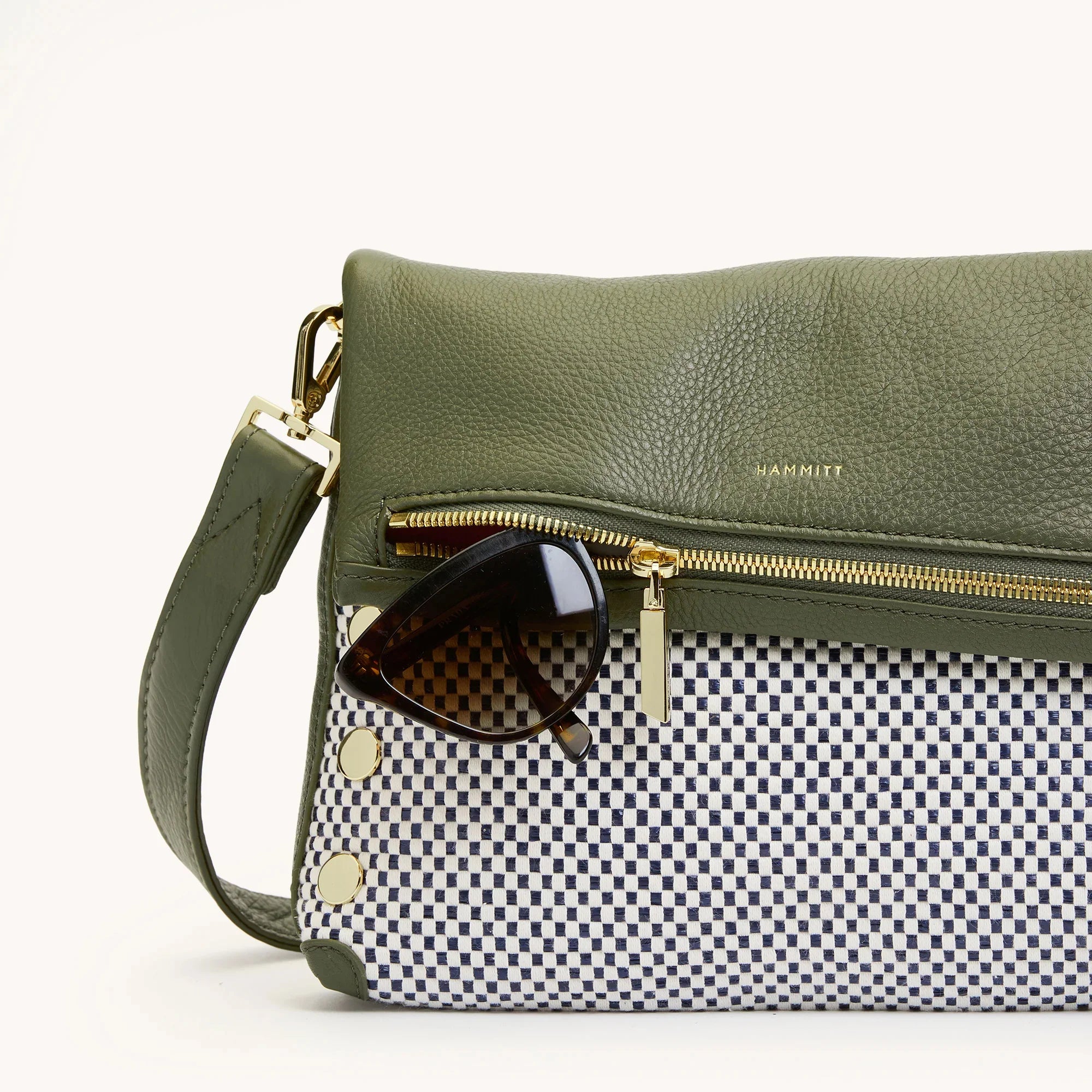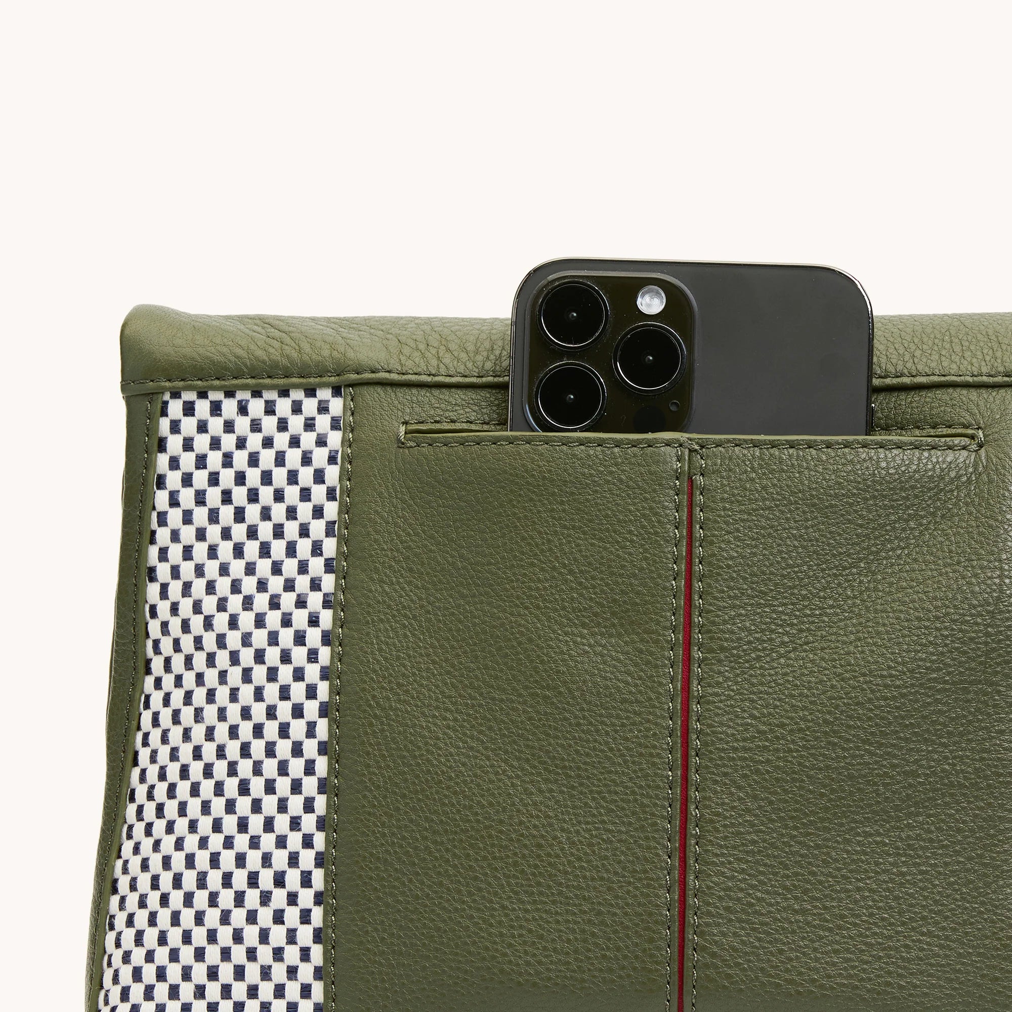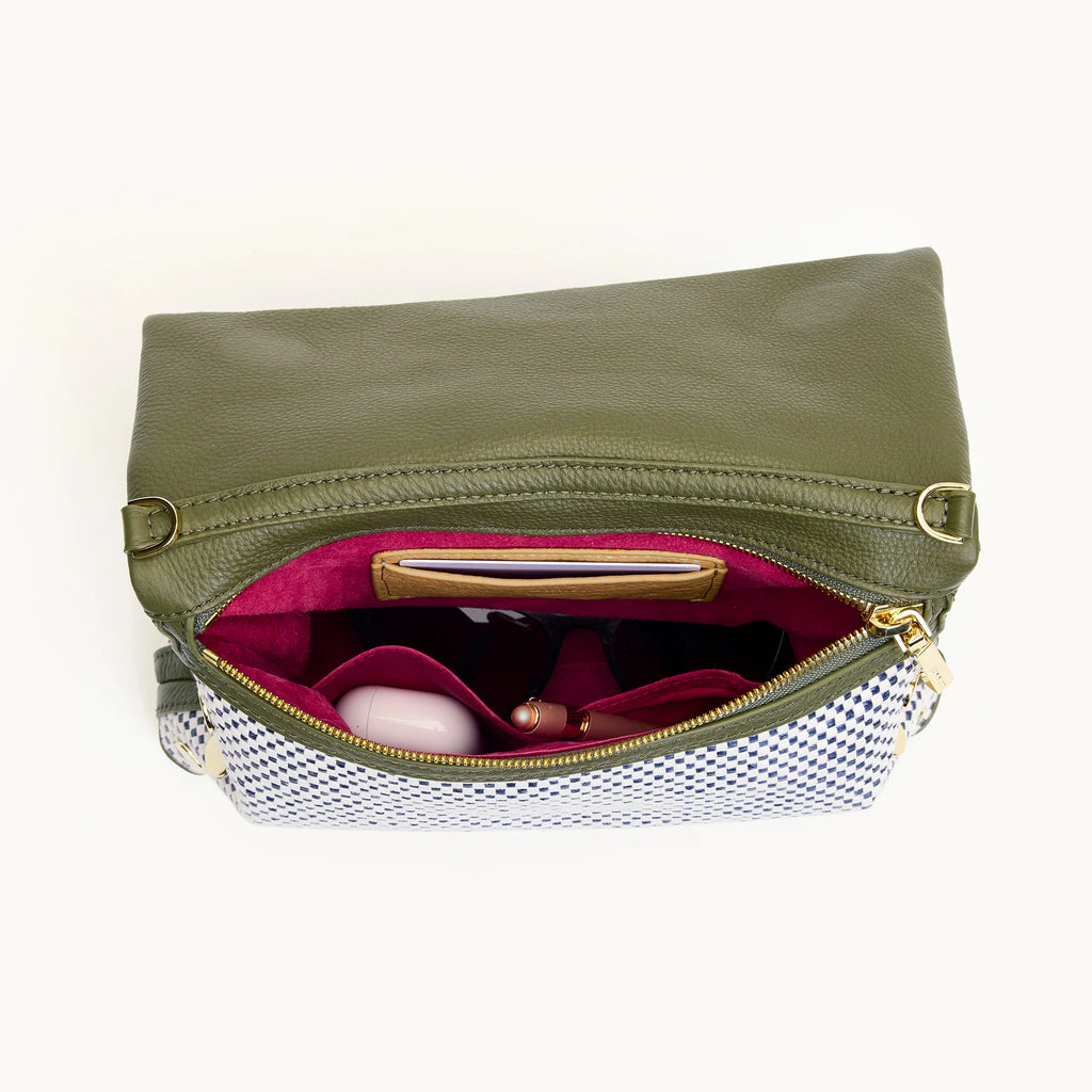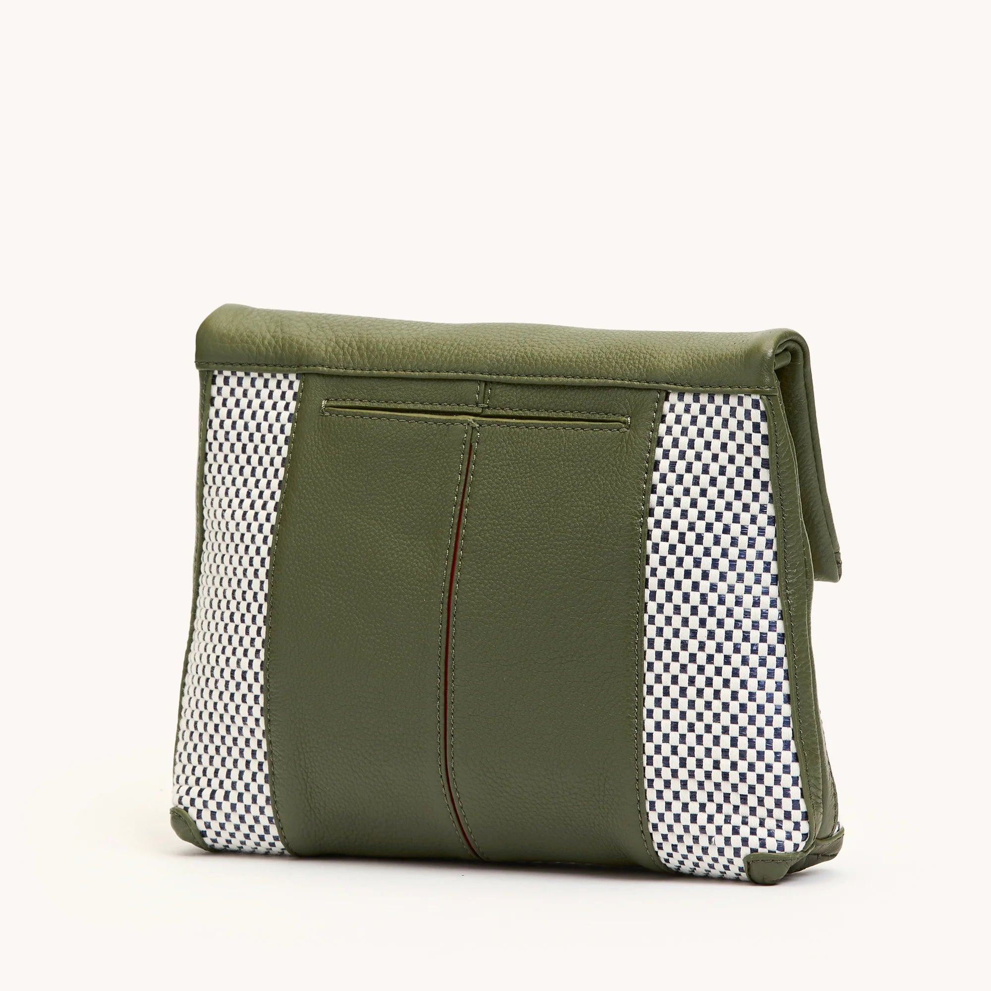 - Crafted with a tight cotton and cord weave of white and deep navy, alongside soft green leather