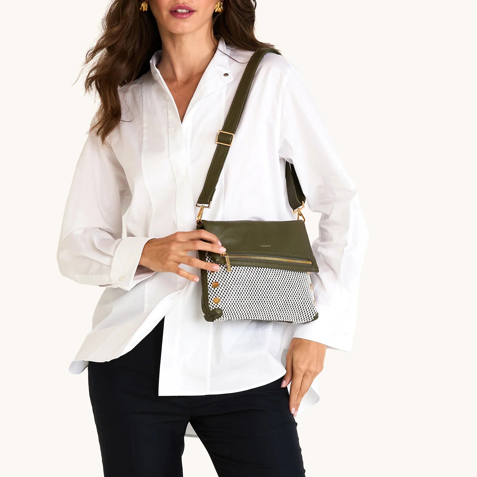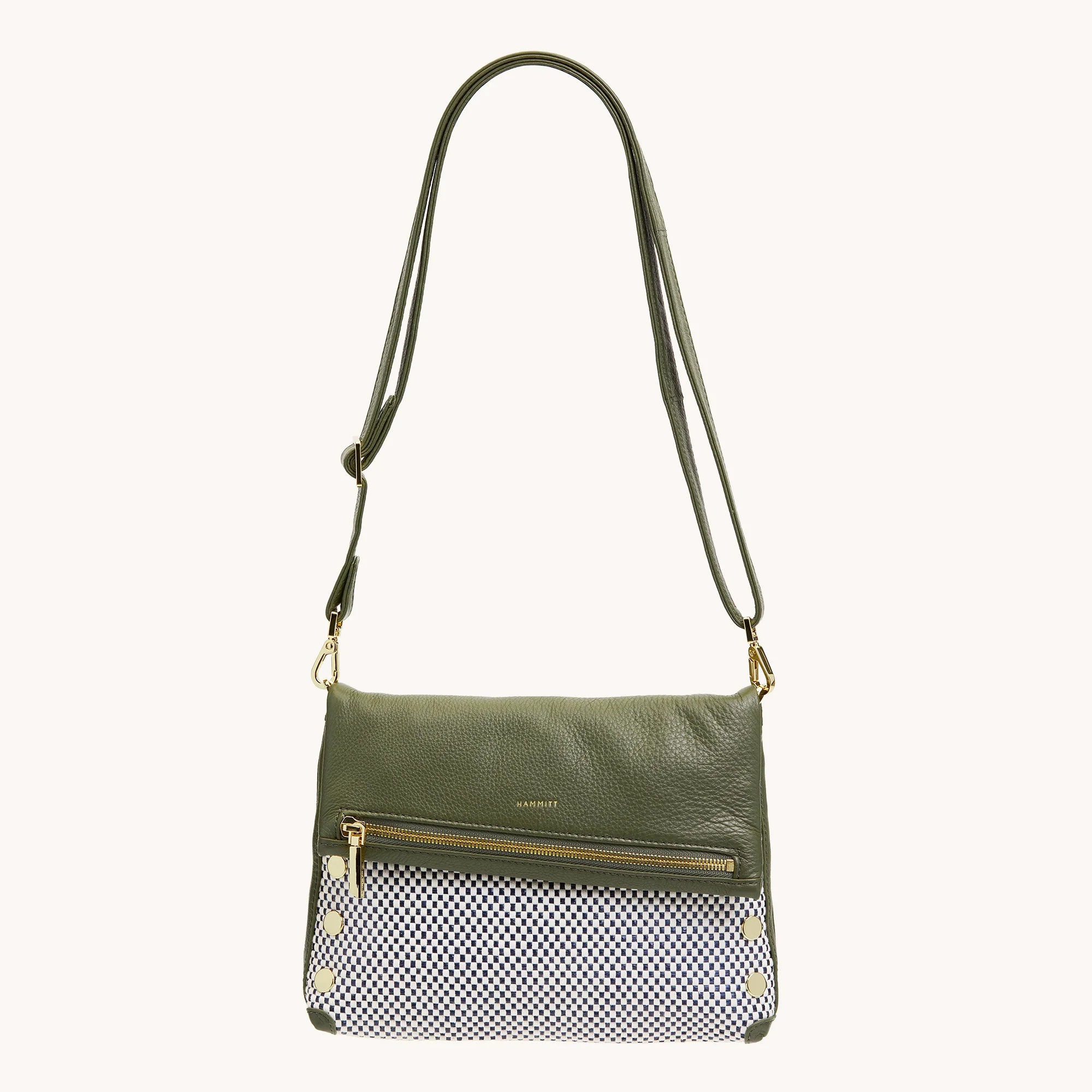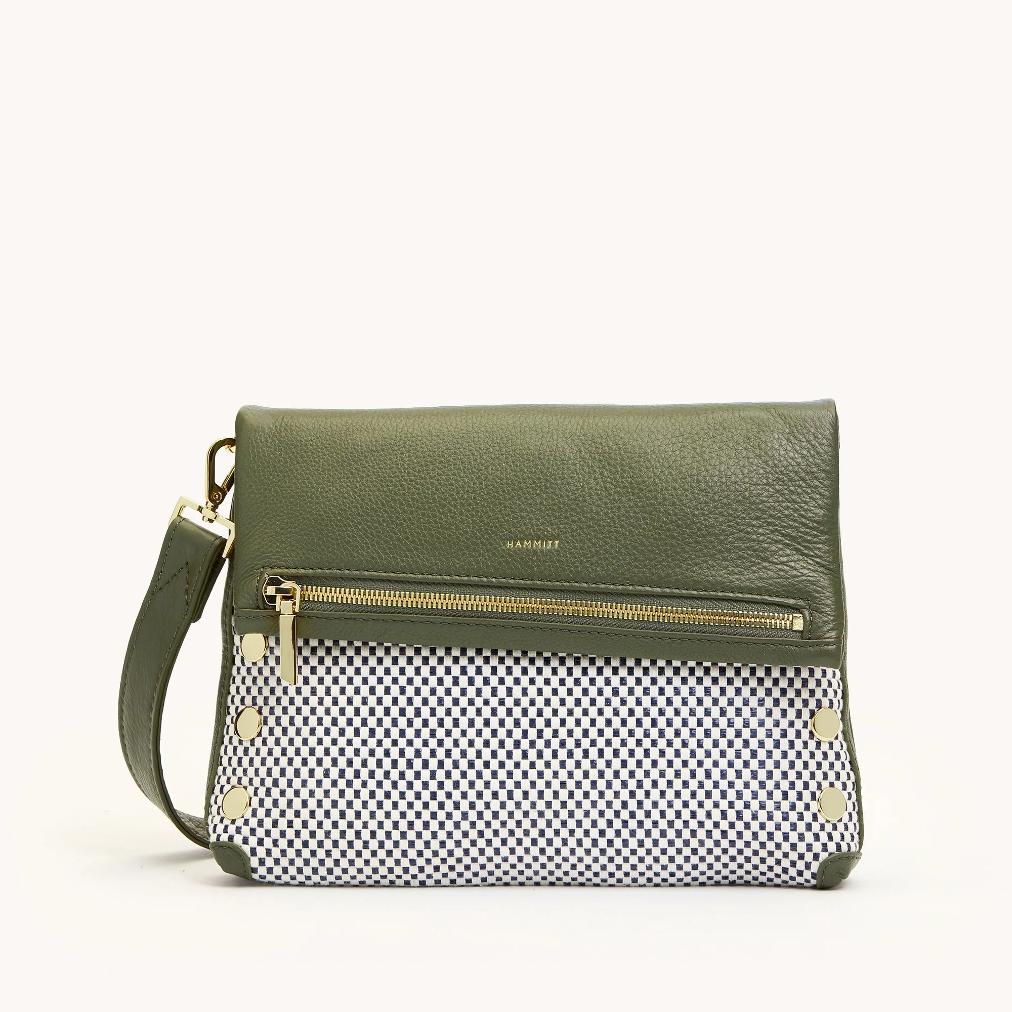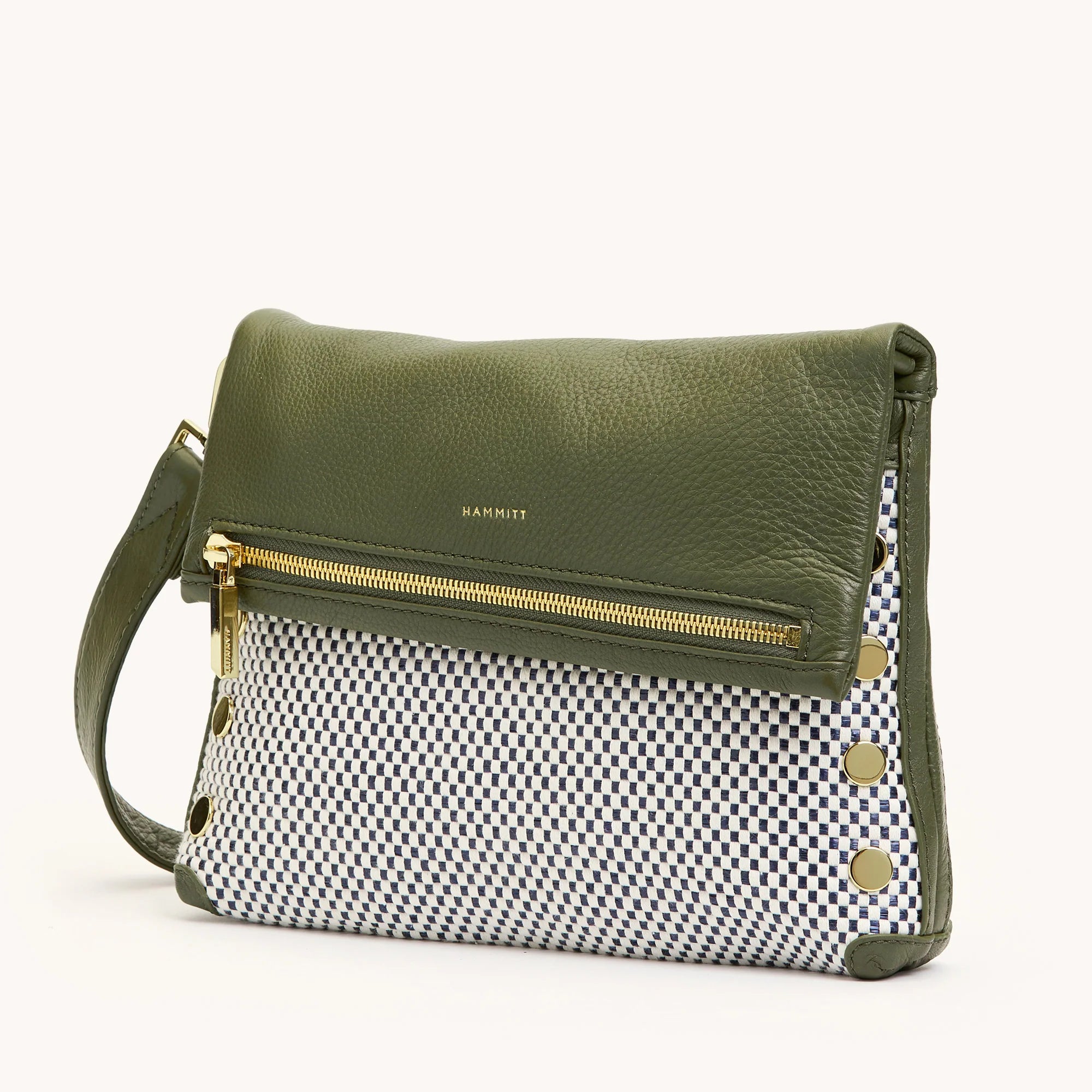 - Crafted with a tight cotton and cord weave of white and deep navy, alongside soft green leather