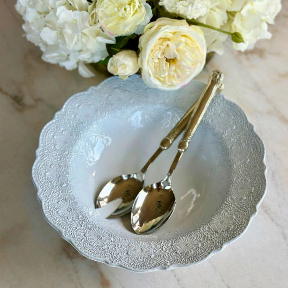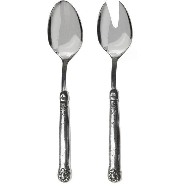 The exquisite salad servers will add a touch of elegance to your table. The detailing is remarkable, with distinctive stamps adding an authentic, vintage look. You will also love the weight and feel of them in your hands. A true heirloom collection.