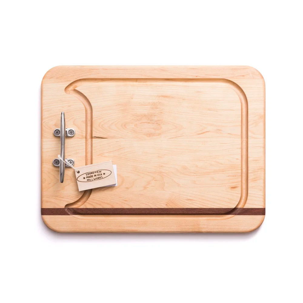 These appetizer boards are great for cheese and crackers or serving up that special dish. The boards feature a stainless nautical cleat, rounded corners and elegant, recessed juice groove, and our signature maple and mahogany design.