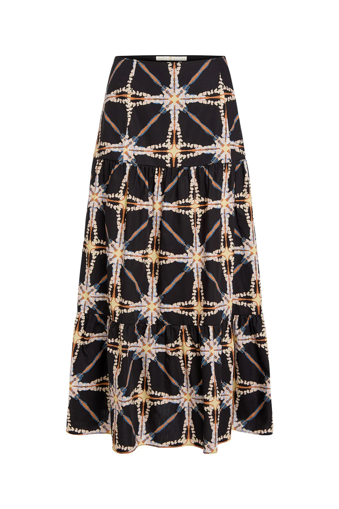 A tiered printed maxi skirt like the new Hines silhouette is a Marie Oliver staple, no matter the season. Shown here in Polaris—a fashion-forward take on tie-dye in a neutral winter palette—Hines brings ease and elegance to year-round dressing.