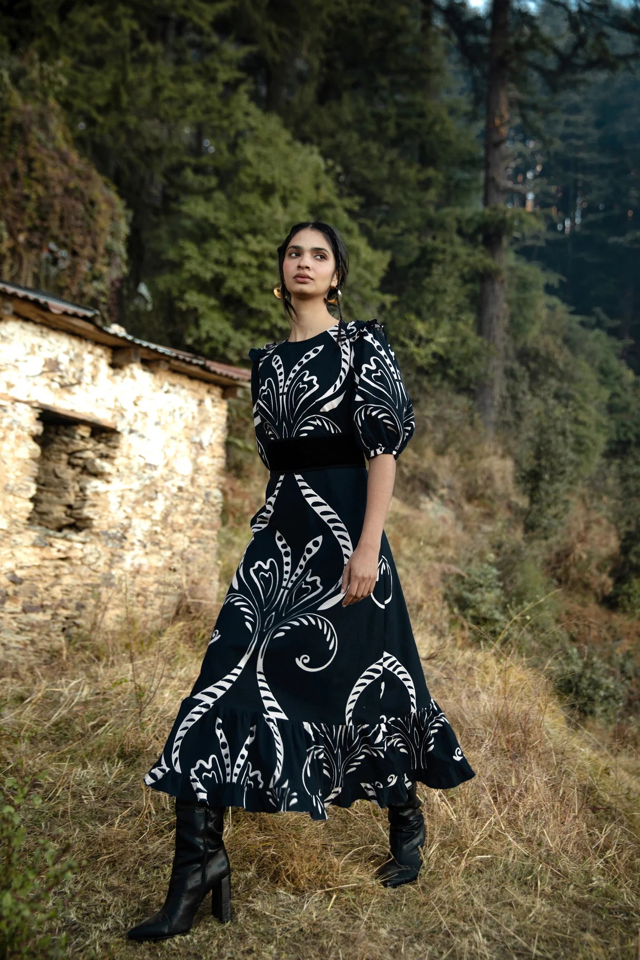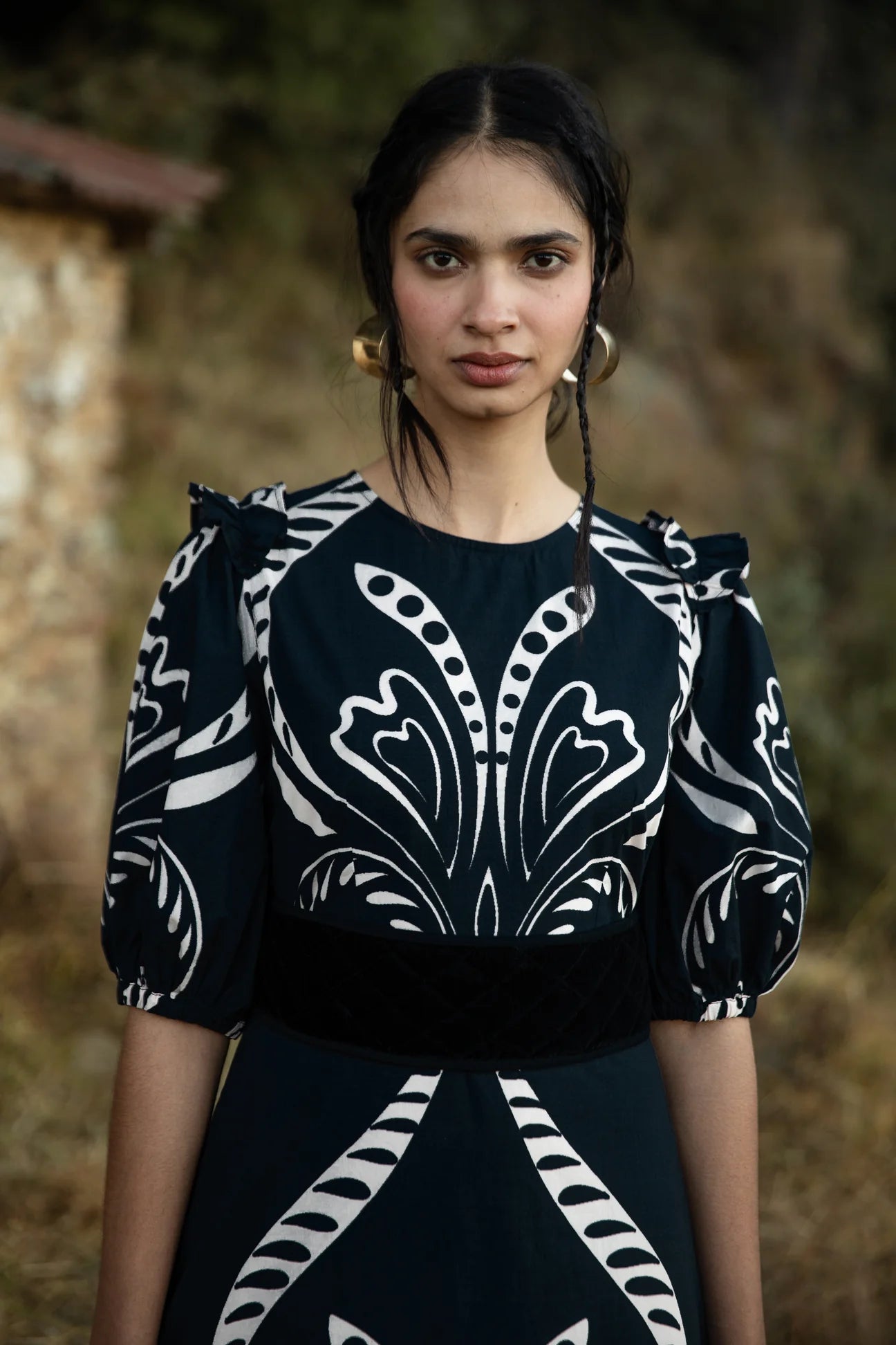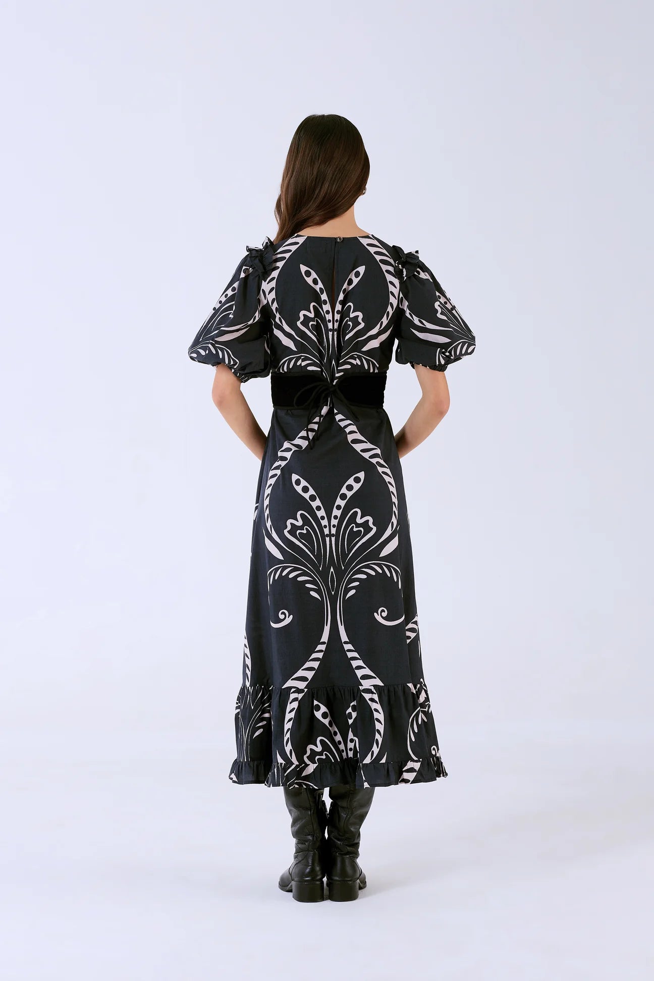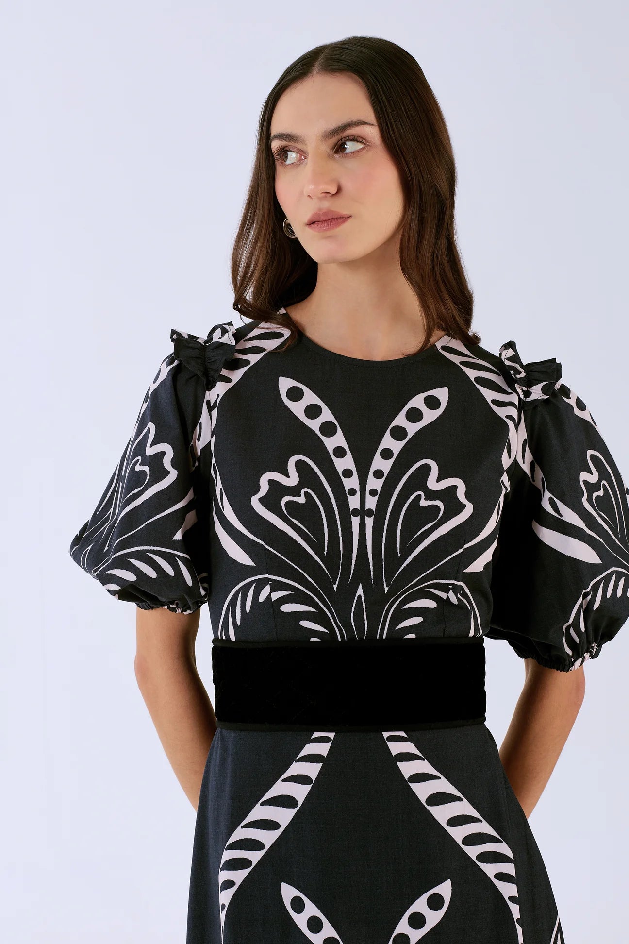 The Antonia is a wonderful choice for special occasions and everyday agendas alike. Cut with puffed sleeves, elastic cuffs and adorned with subtle frills, the Antonia falls to a slender A-line creating a flattering silhouette. Accentuate the waist with the featured belt. Antonia is crafted from crisp cotton poplin, breathable and soft against the skin. ‘Fountain’ is a print artwork that draws from the pure, revitalizing waters of a serene river, capturing that sense of renewal and tranquility.
