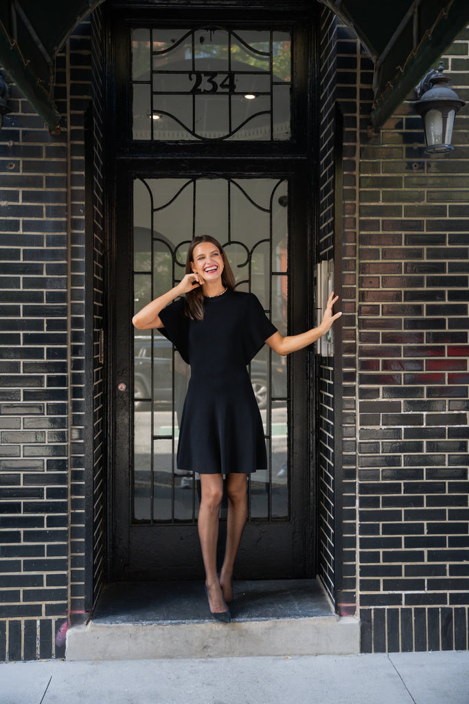 This timeless ribbed knit dress is accentuated with an elegant gold chain trim around the neck. It has a fitted bodice with flutter sleeves, a flared skirt, and a keyhole with button and loop closure at the back neck. Unlined.