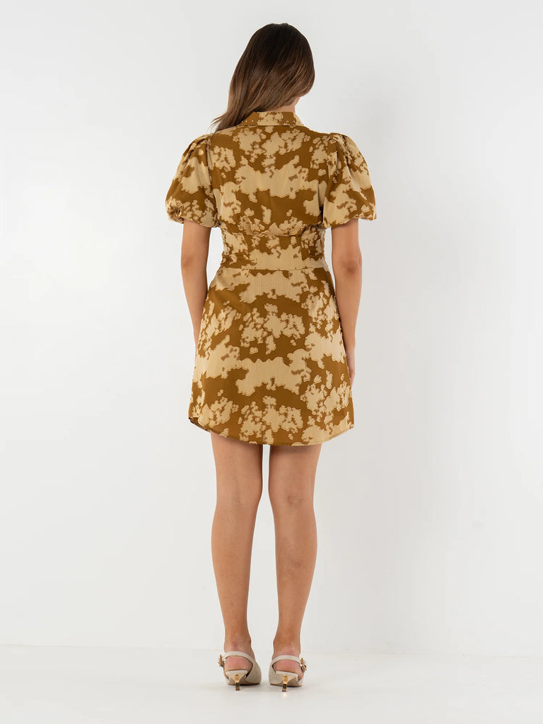The Britt Dress in Hide showcases a tailored yet versatile silhouette with a classic fold collar accented by gold studs, elastic puff sleeves, and a lightly boned bodice for structure. The front button closure is concealed with a studded panel, flowing into a curved shirttail hem that enhances movement and shape. The hide print mimics the rich dimension of cowhide with a modern, elevated twist, finished with a subtle sheen that adds a touch of feminine flair. Designed to flatter, this style also features shaping seams through the waist for a defined fit.