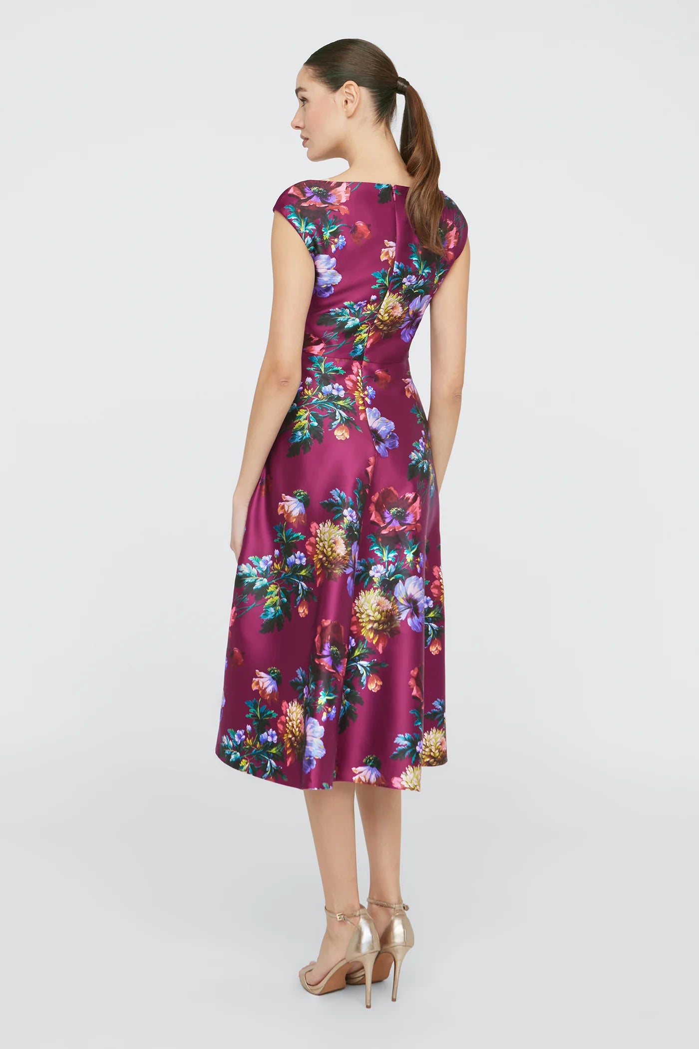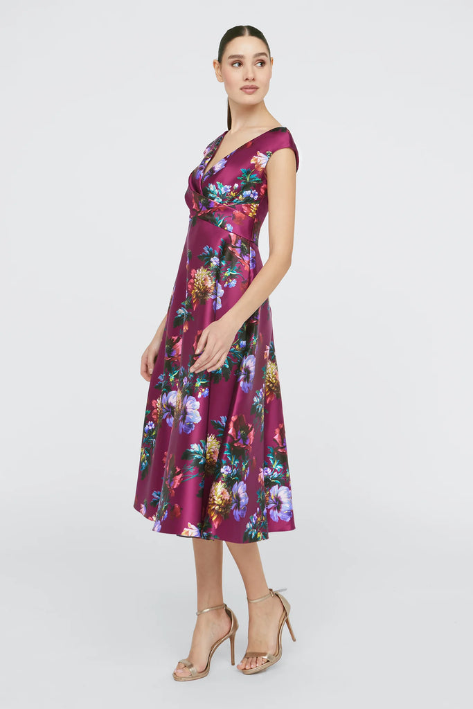 Crafted in floral Mikado, this tea-length dress features a draped V-neck bodice with cap sleeves and a softly flared A-line skirt. The structured fit flatters while offering ease for dancing, toasting, and being the best-dressed guest in the room.