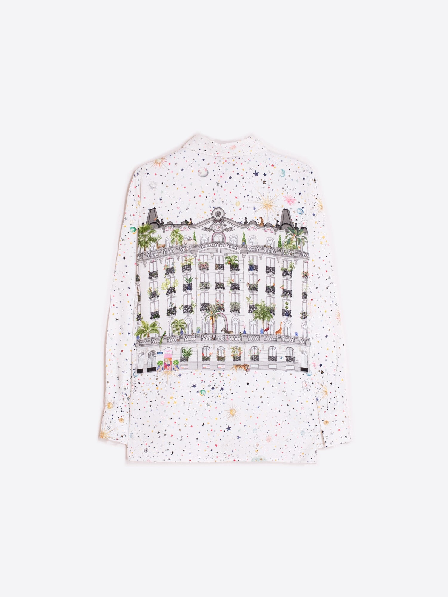 White viscose shirt with multicolour cosmic print and exclusive Vilagallo building placement print on the back. Straight cut, classic shirt collar, long sleeves with buttoned cuffs and slightly rounded hem.