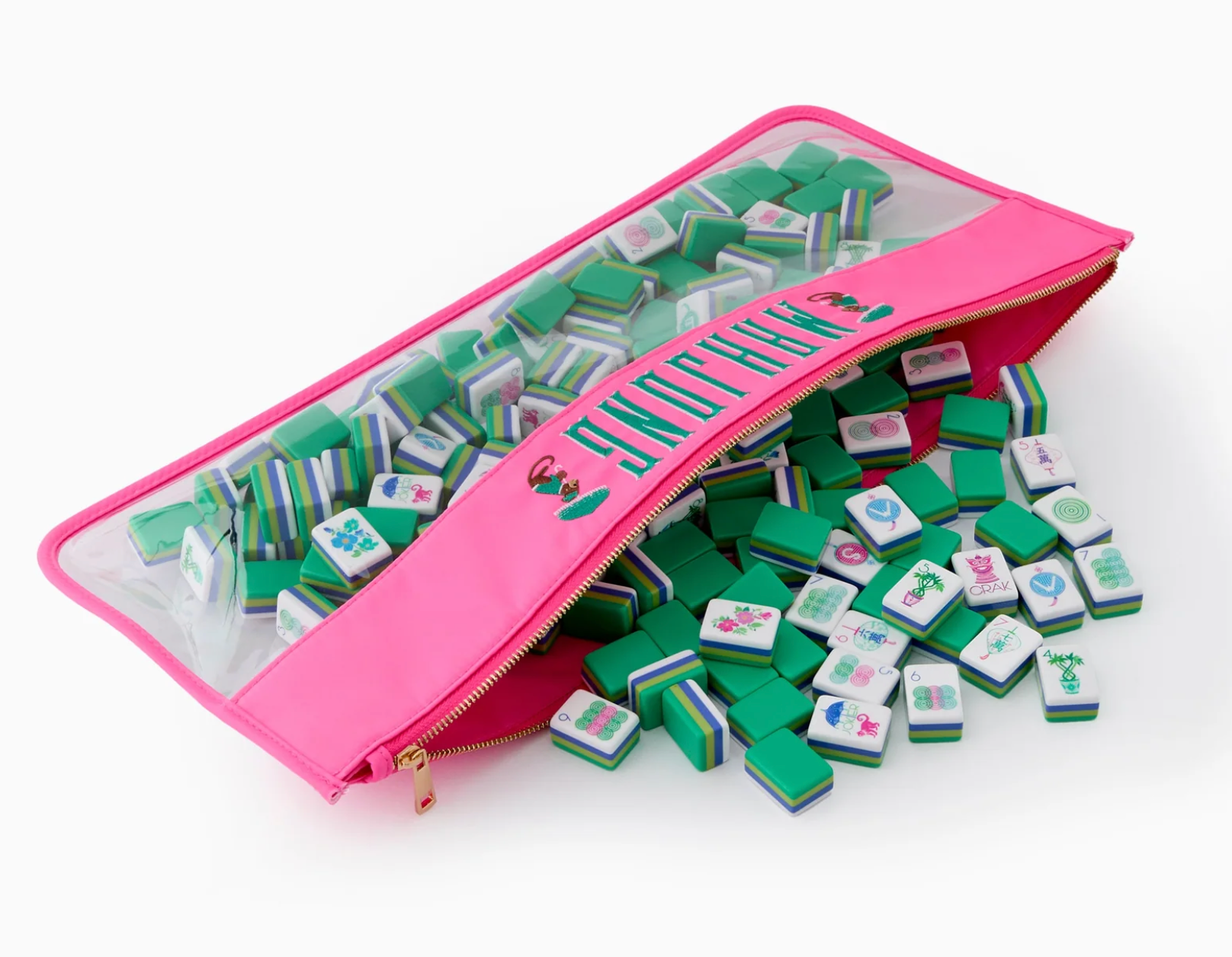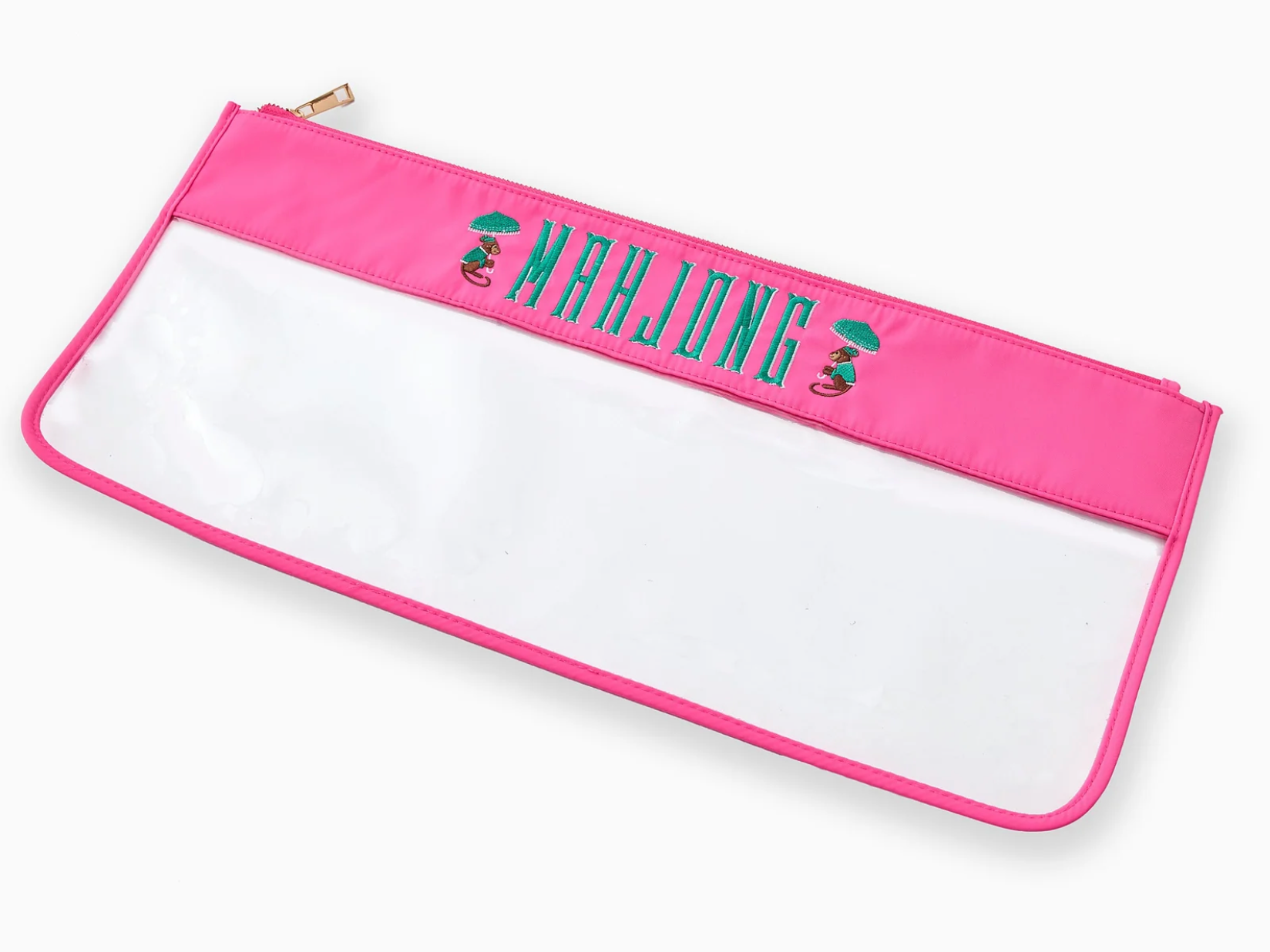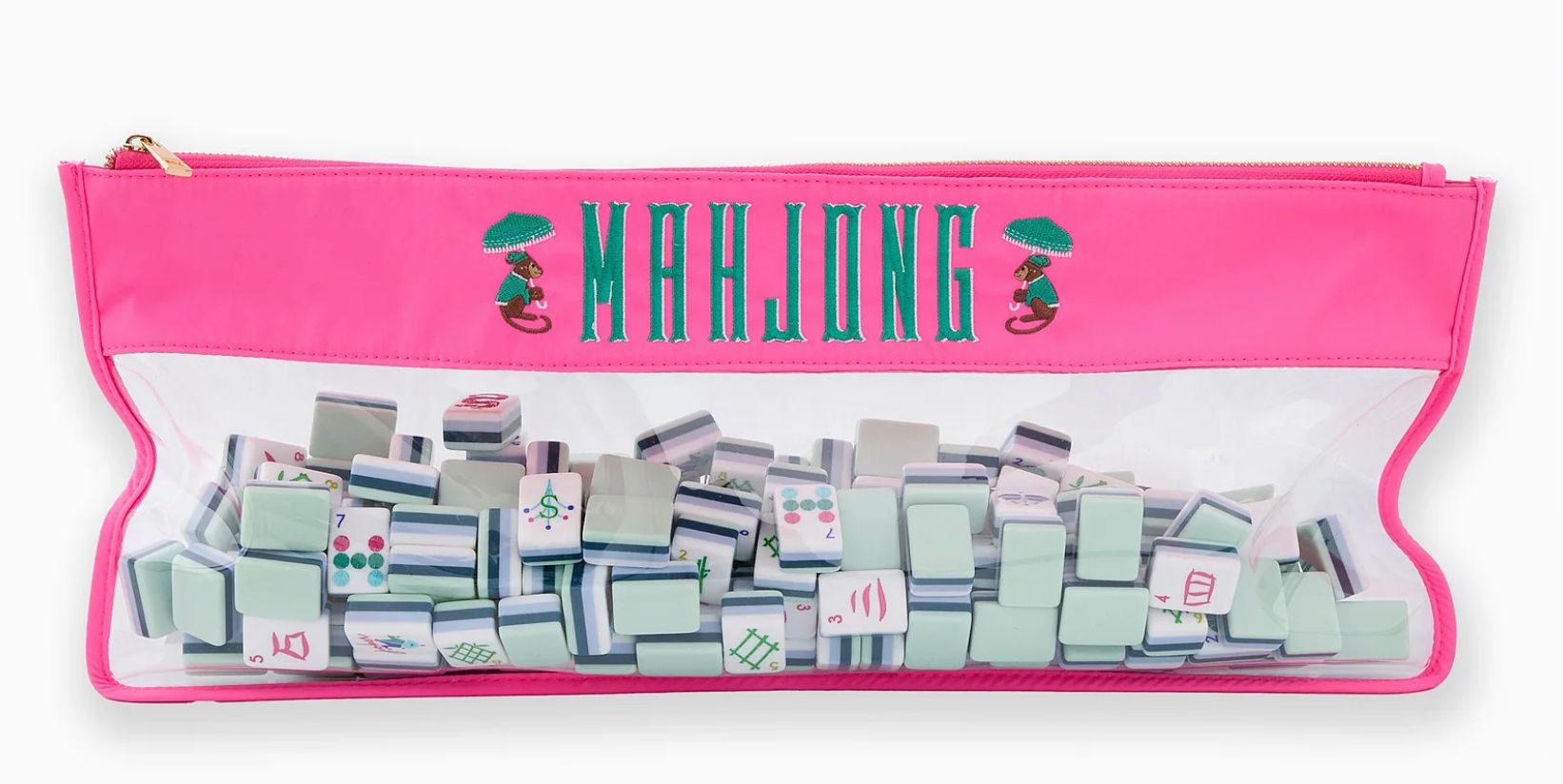 Get ready to mahj in style with the Pink Monkey Zippered Bag! In a bold neon bubblegum pink with vibrant rich teal embroidery, this playful bag is framed by two adorable matching monkeys, adding a fun, cheeky vibe to your game night. It’s as functional as it is fabulous, with a spacious interior, secure zipper closure, and a clear bottom section to show off your tiles in style. Perfect for those who love to make a statement while keeping their game essentials safe and sound!