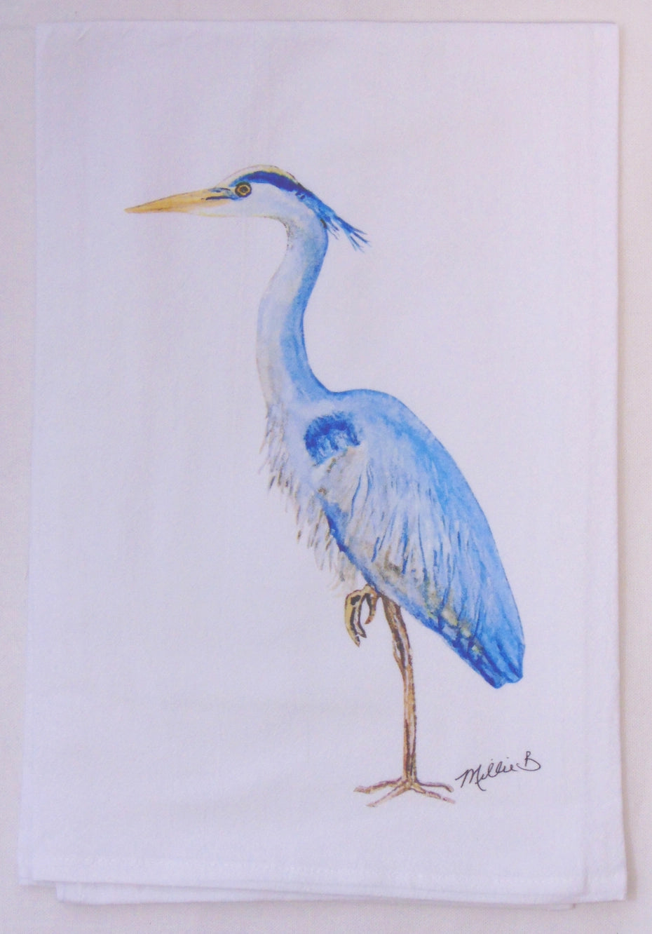 - Limited edition Watercolor Tall Blue Heron print on white flour sack towel