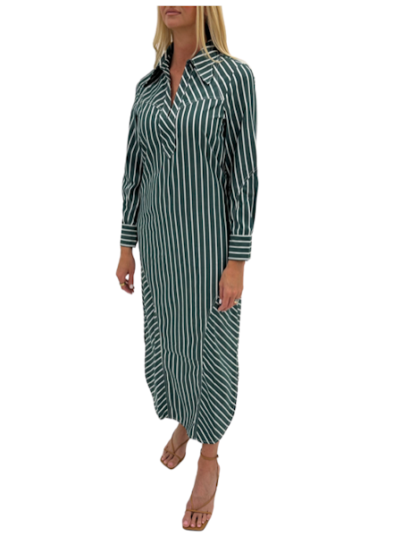 The Drew Midi Dress features a classic poplin fabric with subtle stripes, offering both comfort and style. Its long sleeves and midi length make it a versatile choice for various occasions, providing a polished look that's perfect for day to night wear. The breathable material ensures ease of movement, while the tailored silhouette flatters your figure effortlessly.