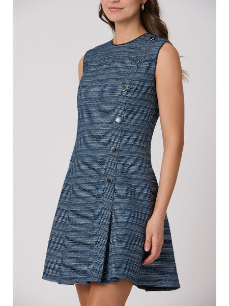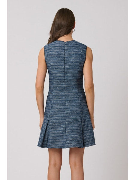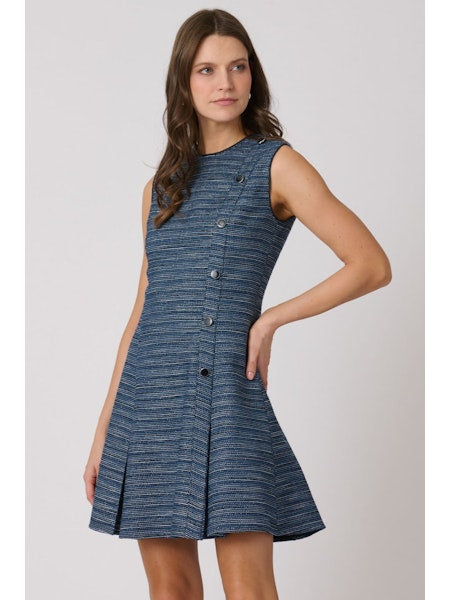 The Gigi Dress is a sleeveless tweed mini dress that combines classic texture with a modern silhouette. Its tailored fit and timeless fabric make it perfect for both casual outings and dressier occasions, offering a chic and versatile addition to your wardrobe.