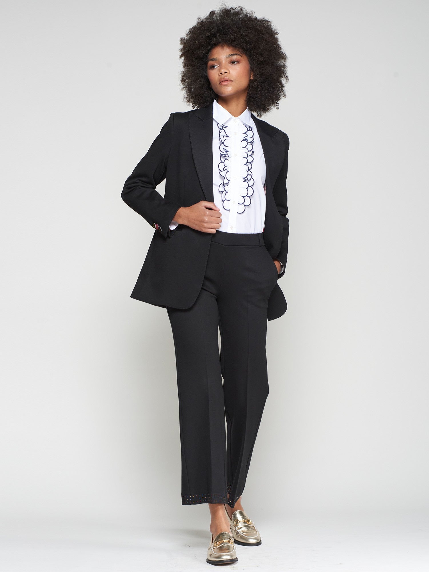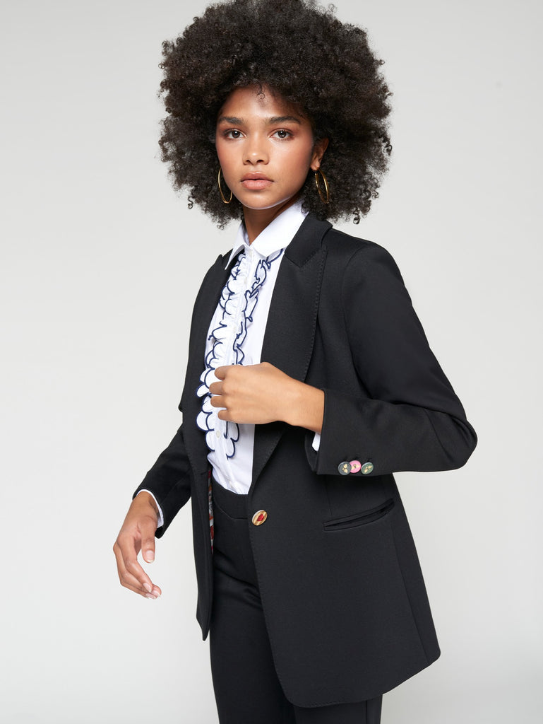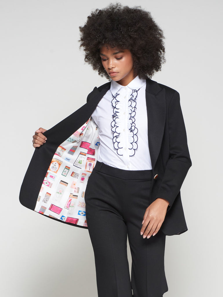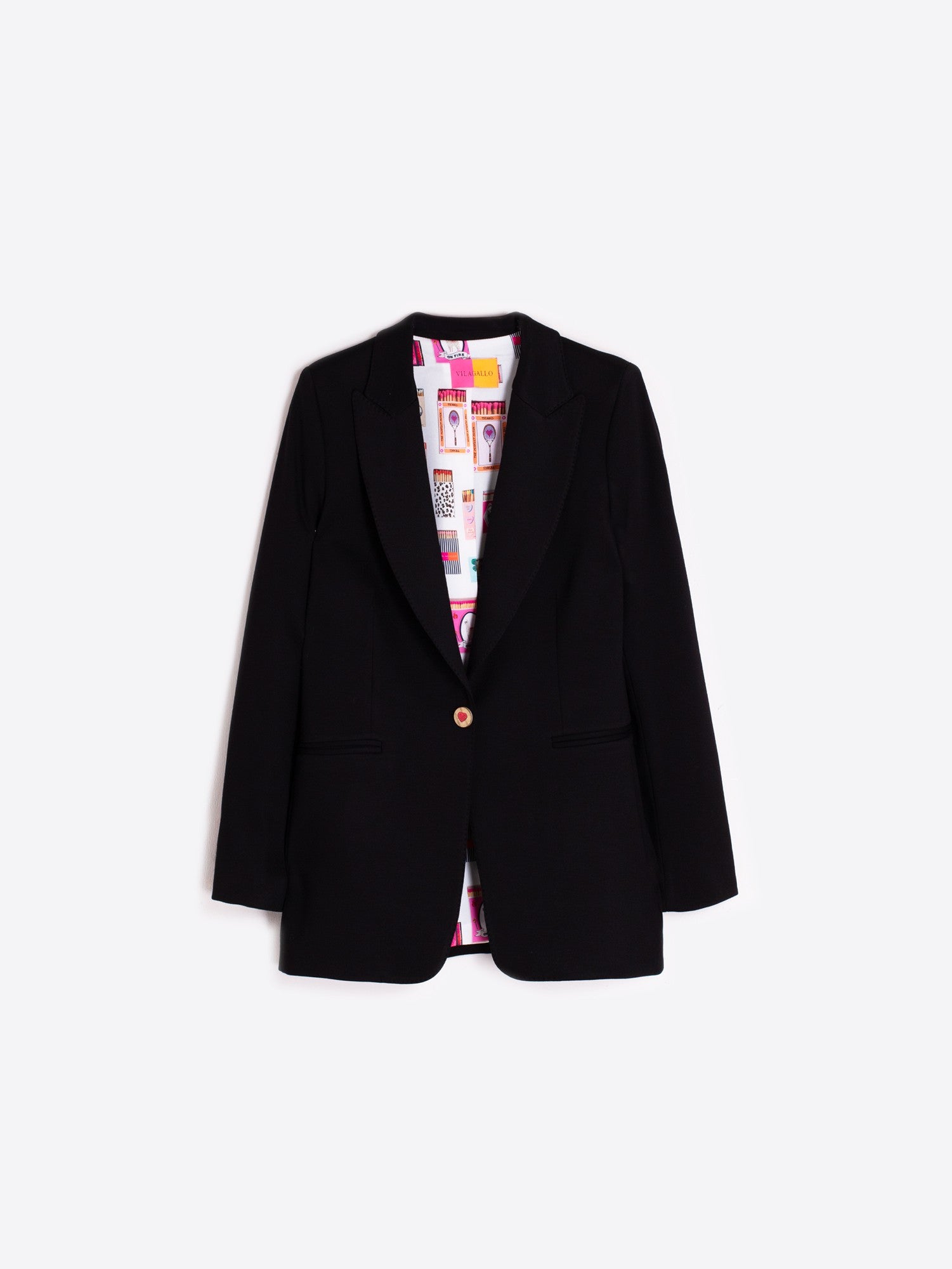 Black blazer made of stretch-knit fabric with a straight cut and classic notch lapel. Features a front gold-tone button with a red heart design and three illustrated buttons on the cuffs. Two welt pockets at the front. Interior lining printed.