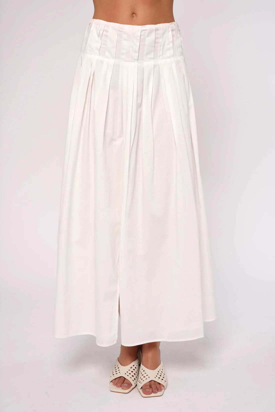 The Cara Skirt has decorative pleats at the waist and made in signature cotton poplin fabric. This skirt also features a front slit and smocked back waist panel for easy wearing.
