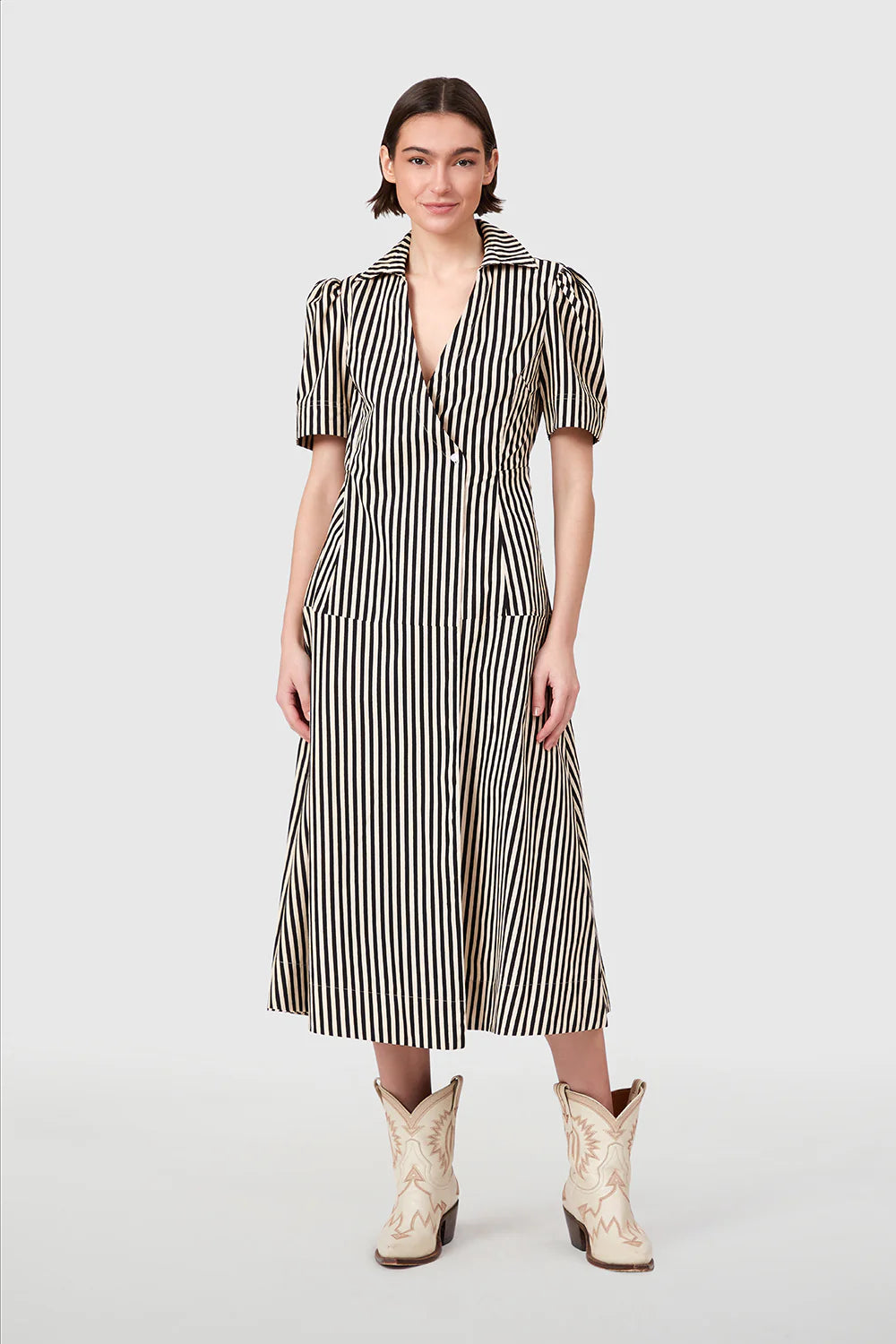 The Clark Dress features a flattering faux-wrap bodice with a notched collar and short, tailored sleeves. It’s designed with a defined waist and an A-line skirt that falls just below the knee, creating a feminine and structured silhouette. A subtle side button detail adds interest to the wrap-style front.