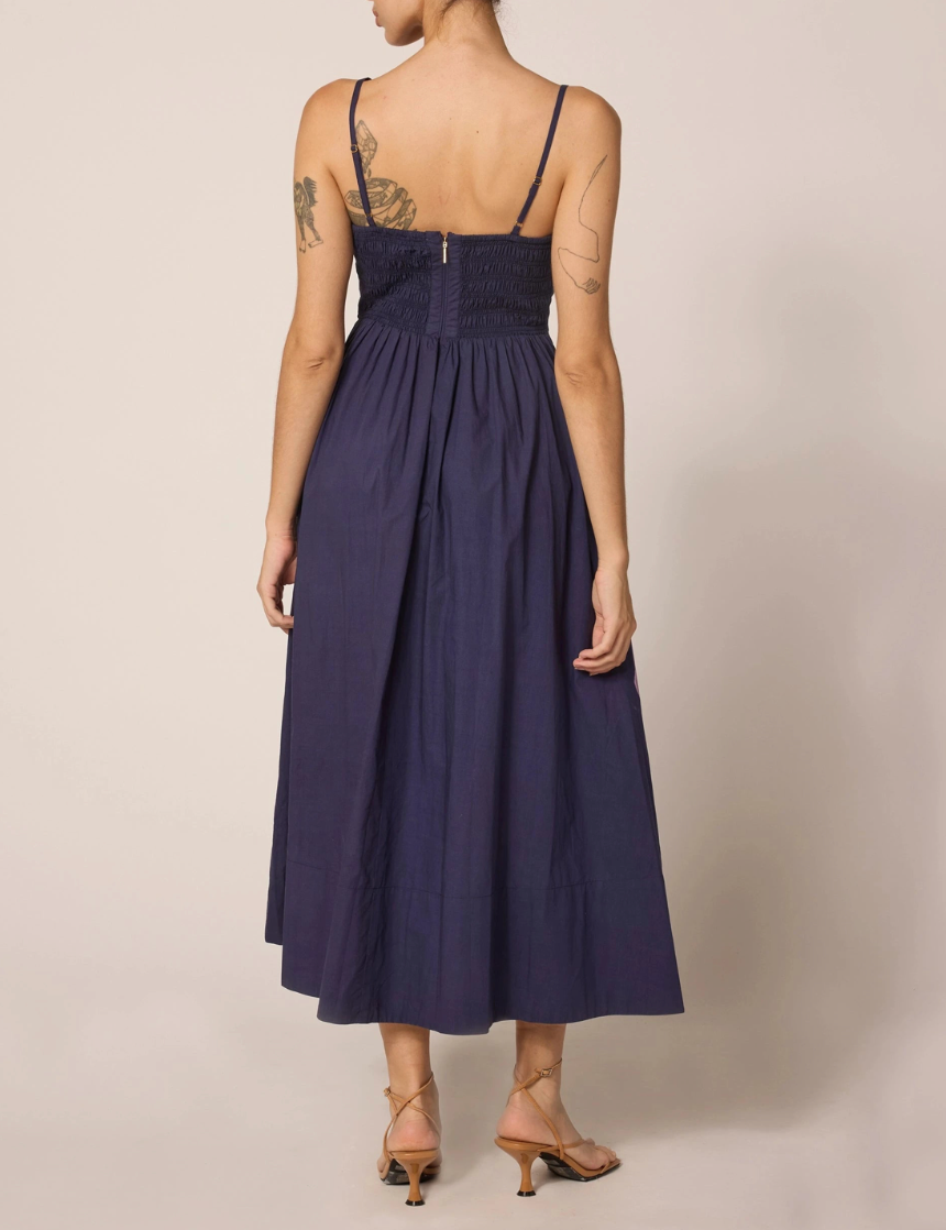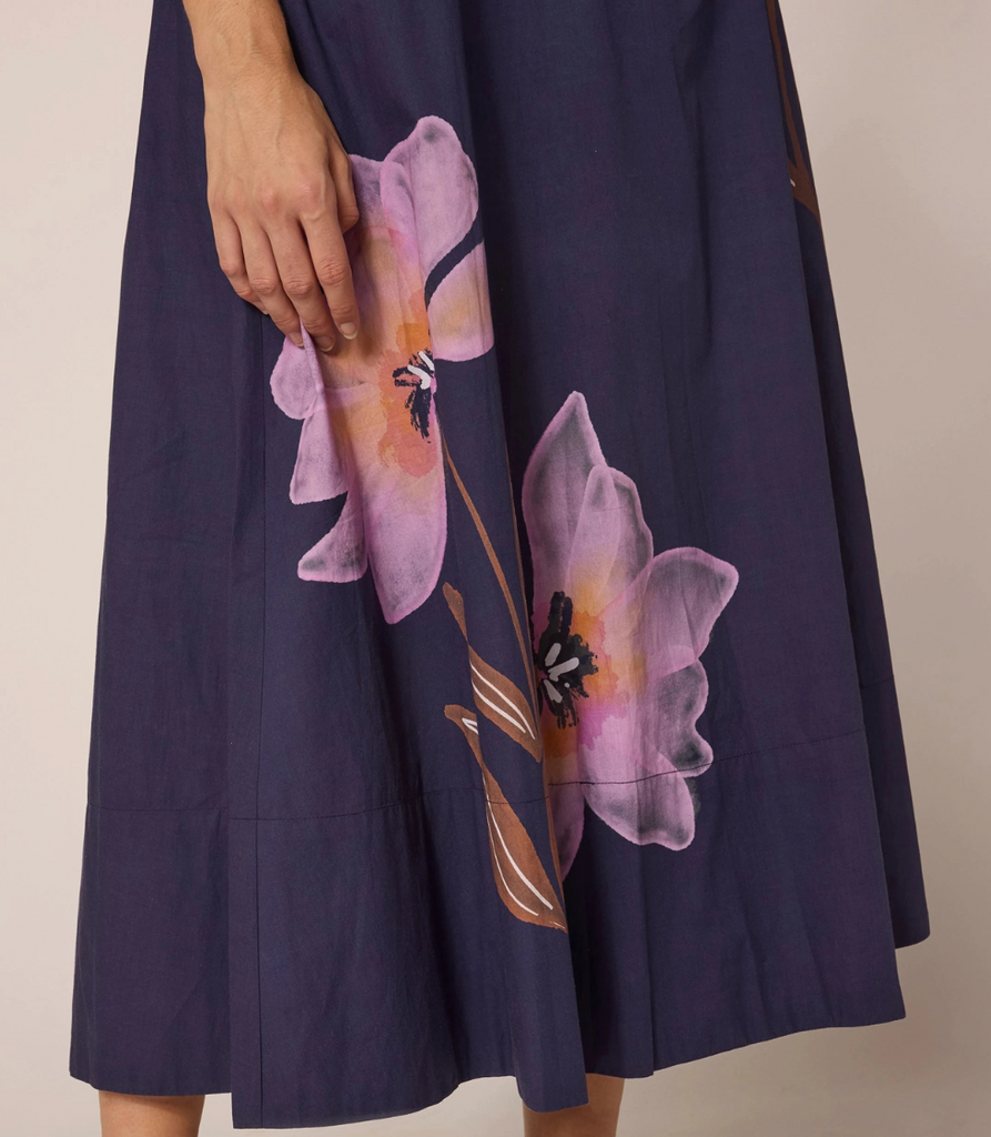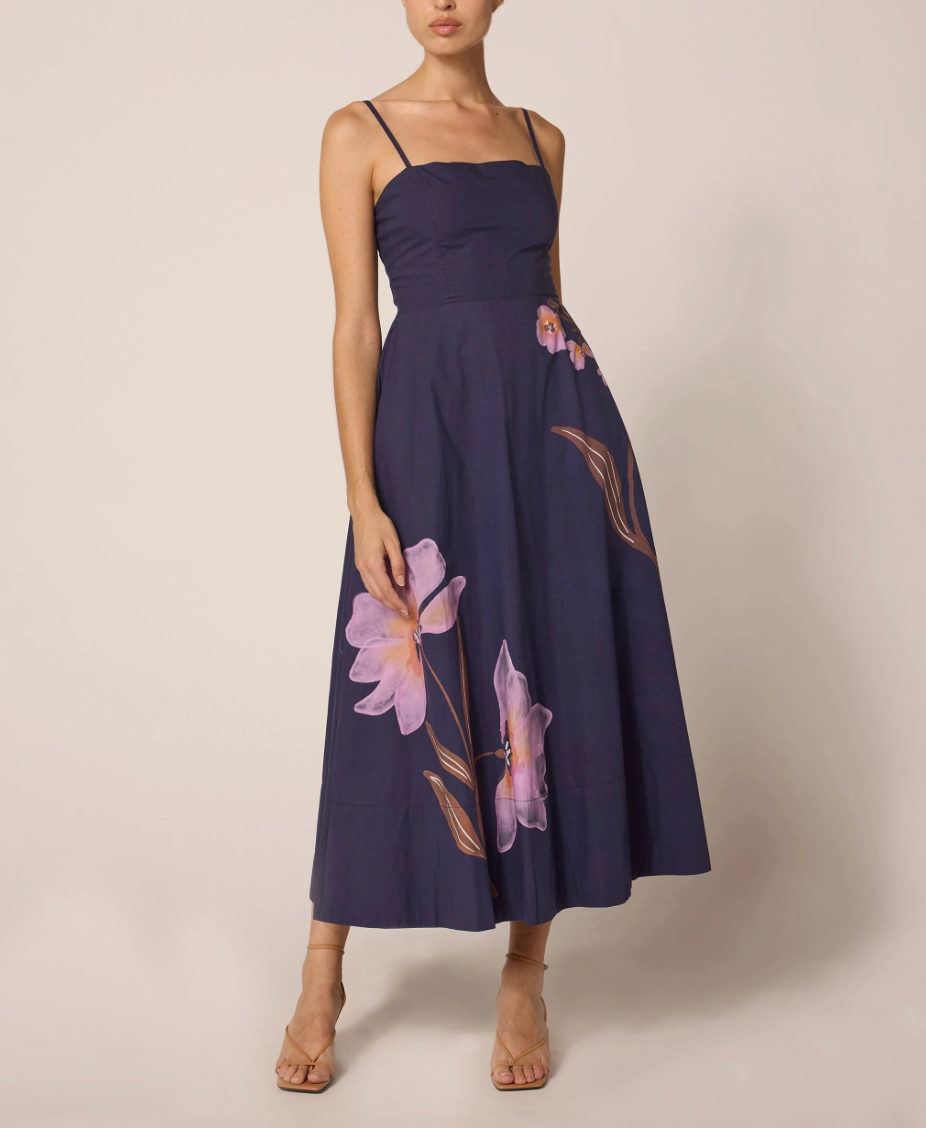 In 100% GOTS certified organic cotton poplin, the Riley Ankle Dress features a square neck with adjustable thin straps. With a large placed floral print at the hip and hem, you'll be sure to turn heads.
