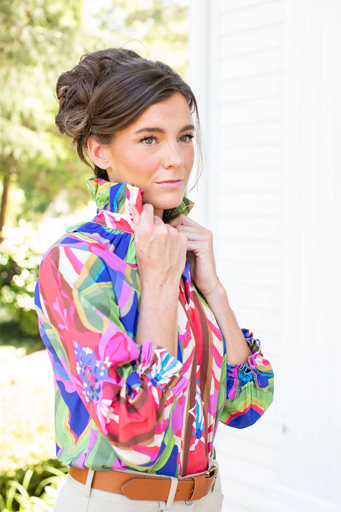 The Harper top is made to dress up or down with its double ruffle collar and easy push up sleeves. It’s tunic length is perfect to wear untucked or tucked into your favorite jeans or skirt.