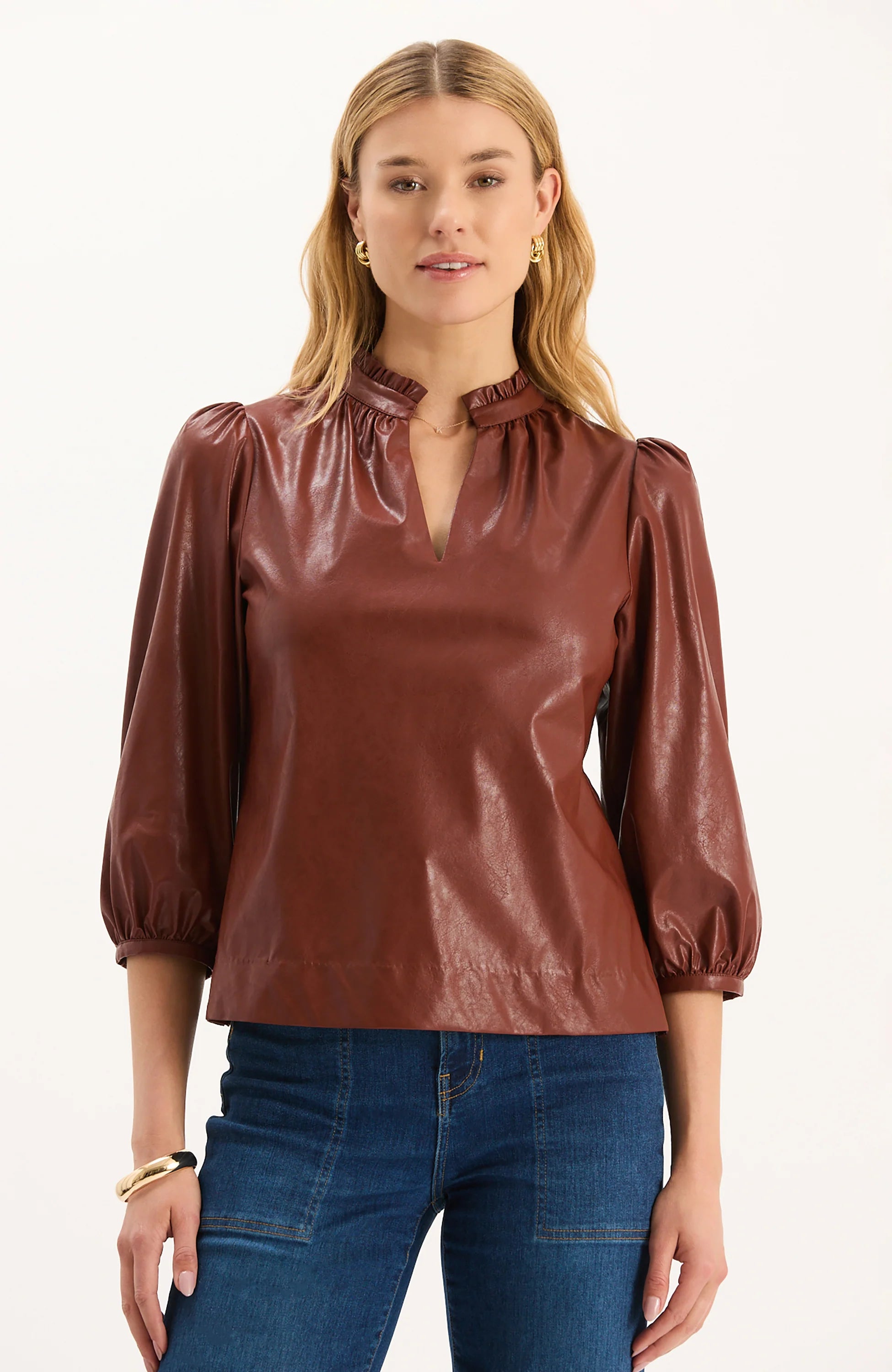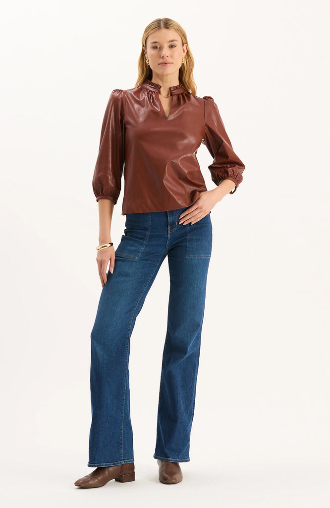 Designed with a sleek rounded notch neckline, softly puffed shoulders, and three-quarter sleeves, this vegan leather top strikes the perfect balance between structured and feminine. Lightweight yet statement-making, this piece is easy to wear on its own or layered as the seasons change.
