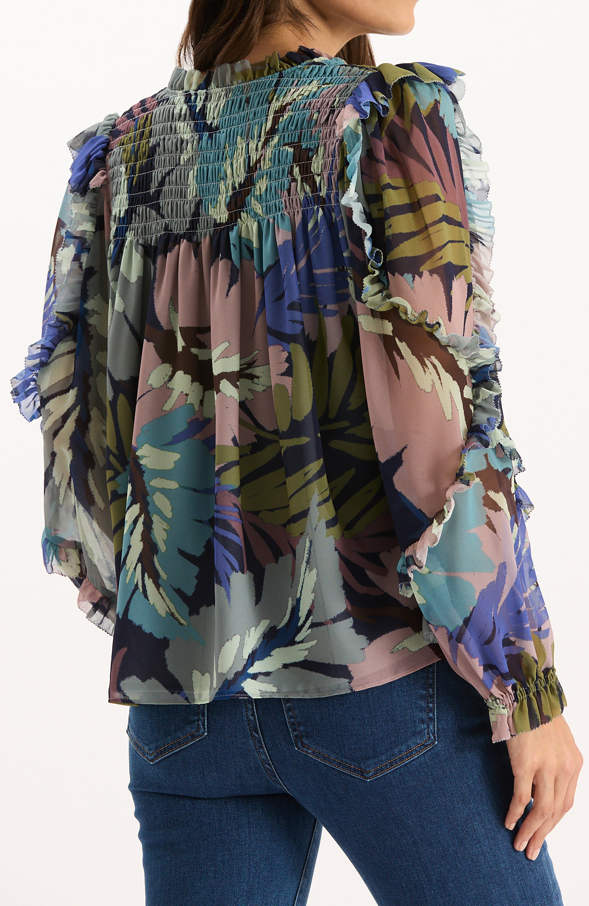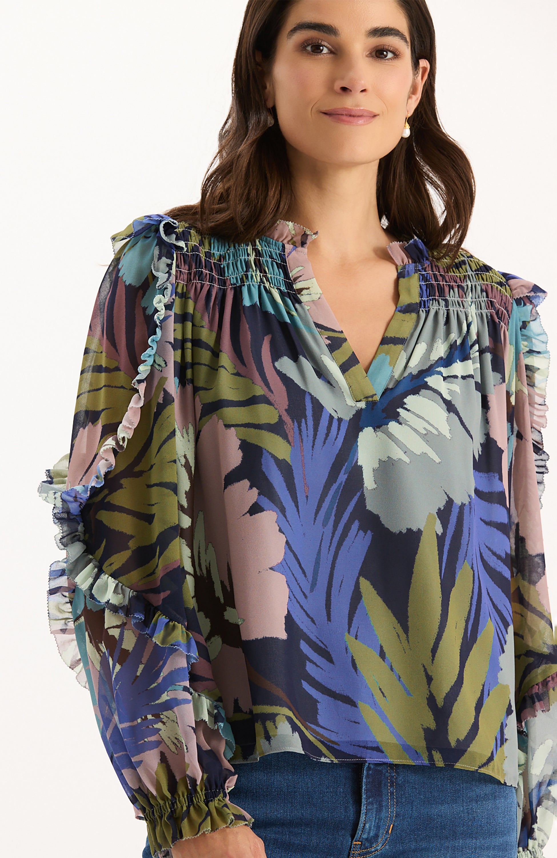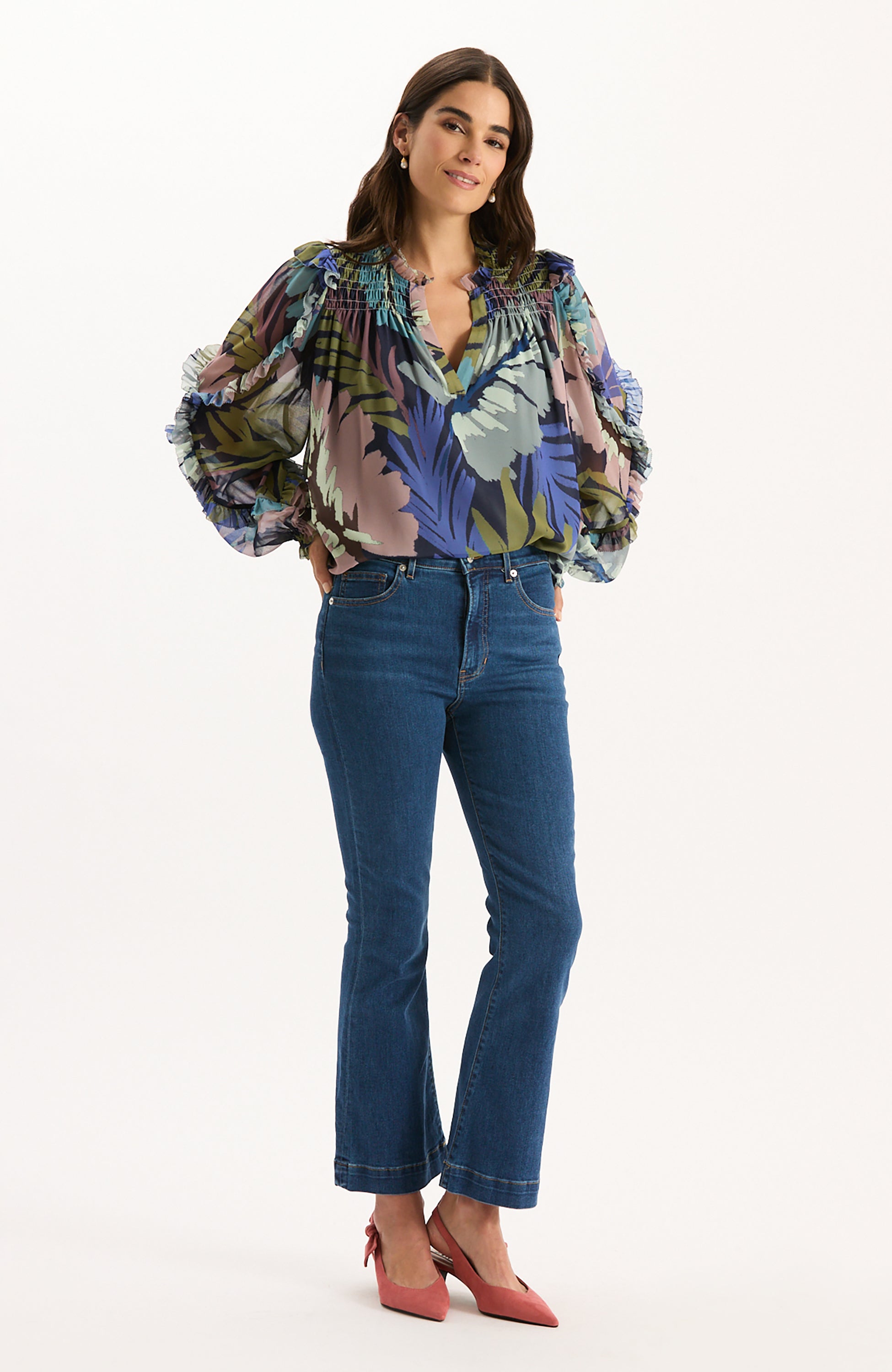 The Sylvie Silk Blouse features a flattering v-neckline and delicate ruffle sleeves, combining elegance with a touch of femininity. Crafted from smooth silk, it offers a lightweight and comfortable fit, perfect for both casual and dressy occasions.