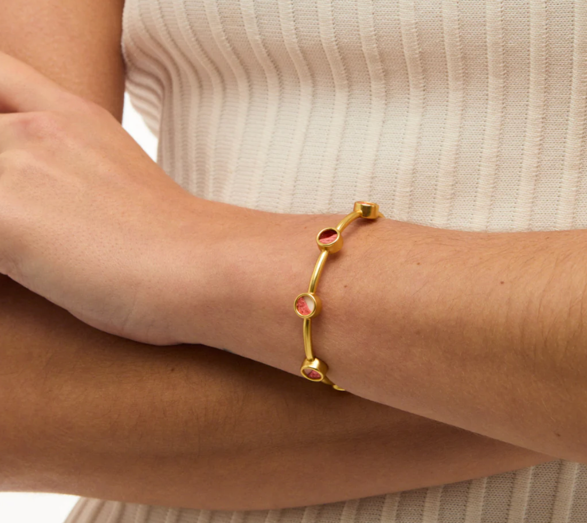 The Brittany Multi-Bezel Cuff is a dainty statement designed for everyday wear. Color-blocked bezels feature ivory, champagne, and rust-dyed goose feathers, accented with a pop of coral peacock sword for subtle texture and dimension. Finished in 18kt matte gold plating, this lightweight cuff adds an easy touch of polish - perfect for stacking or wearing solo for a refined look.